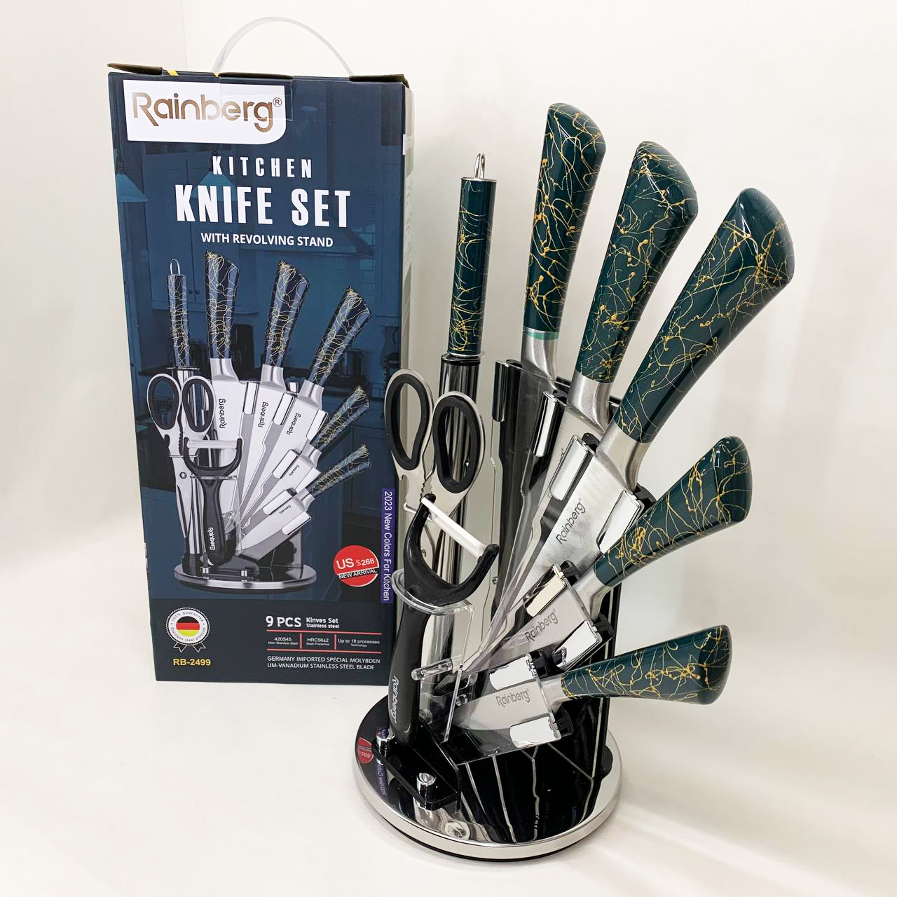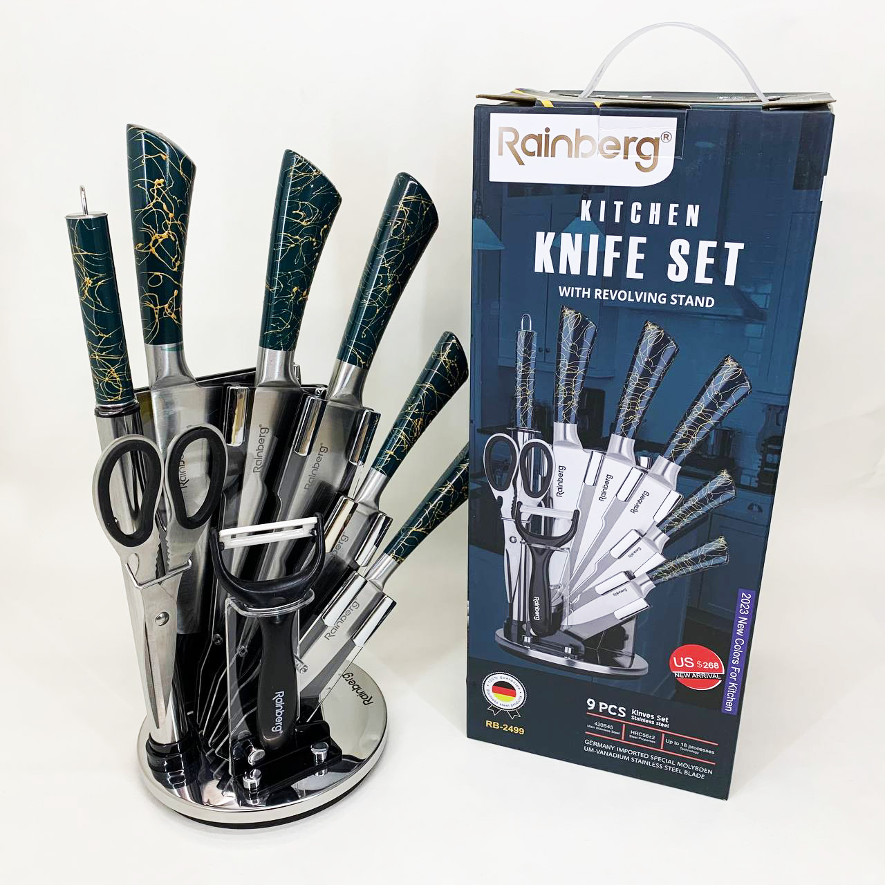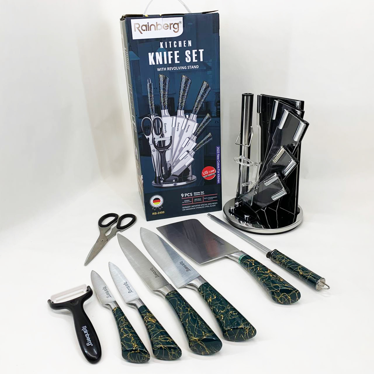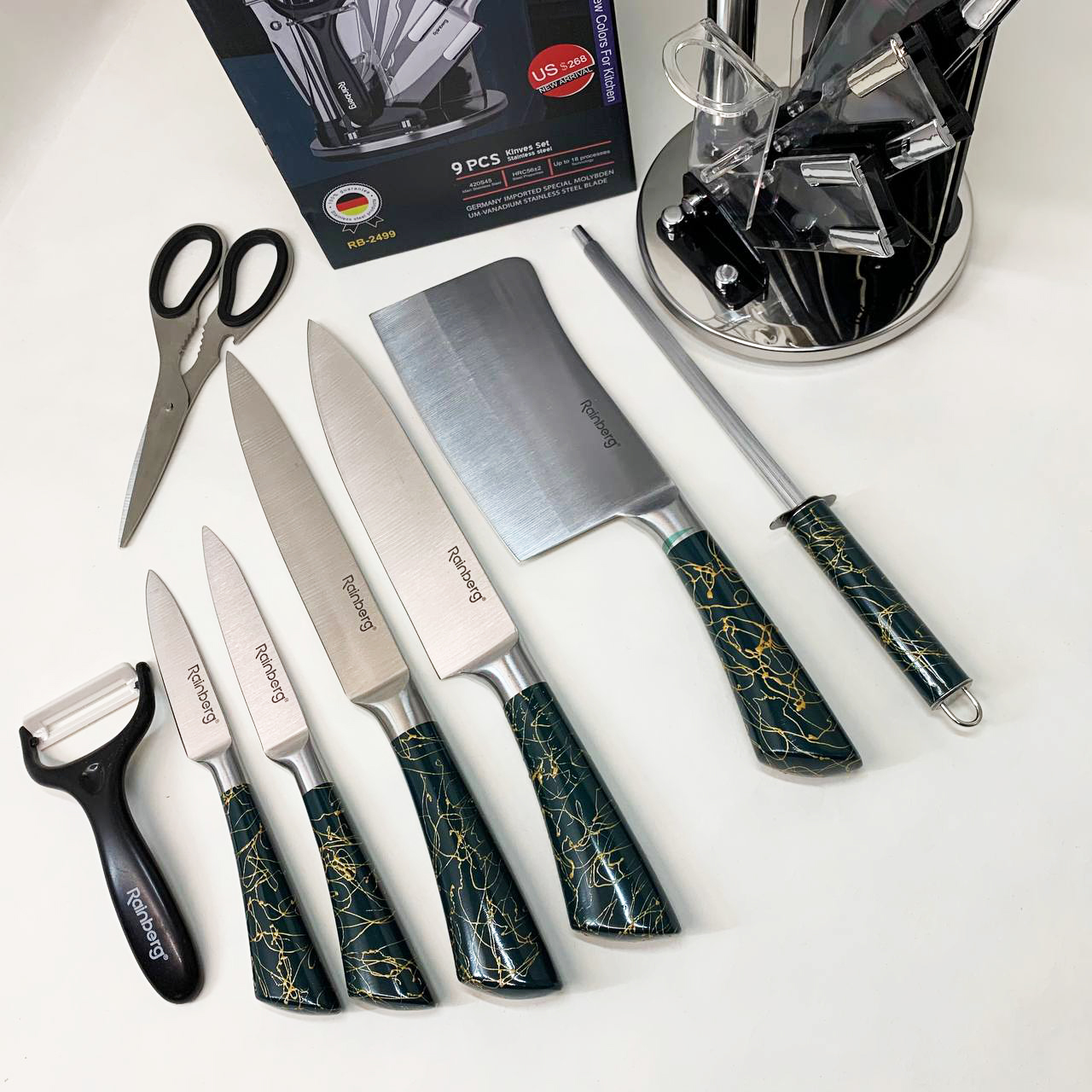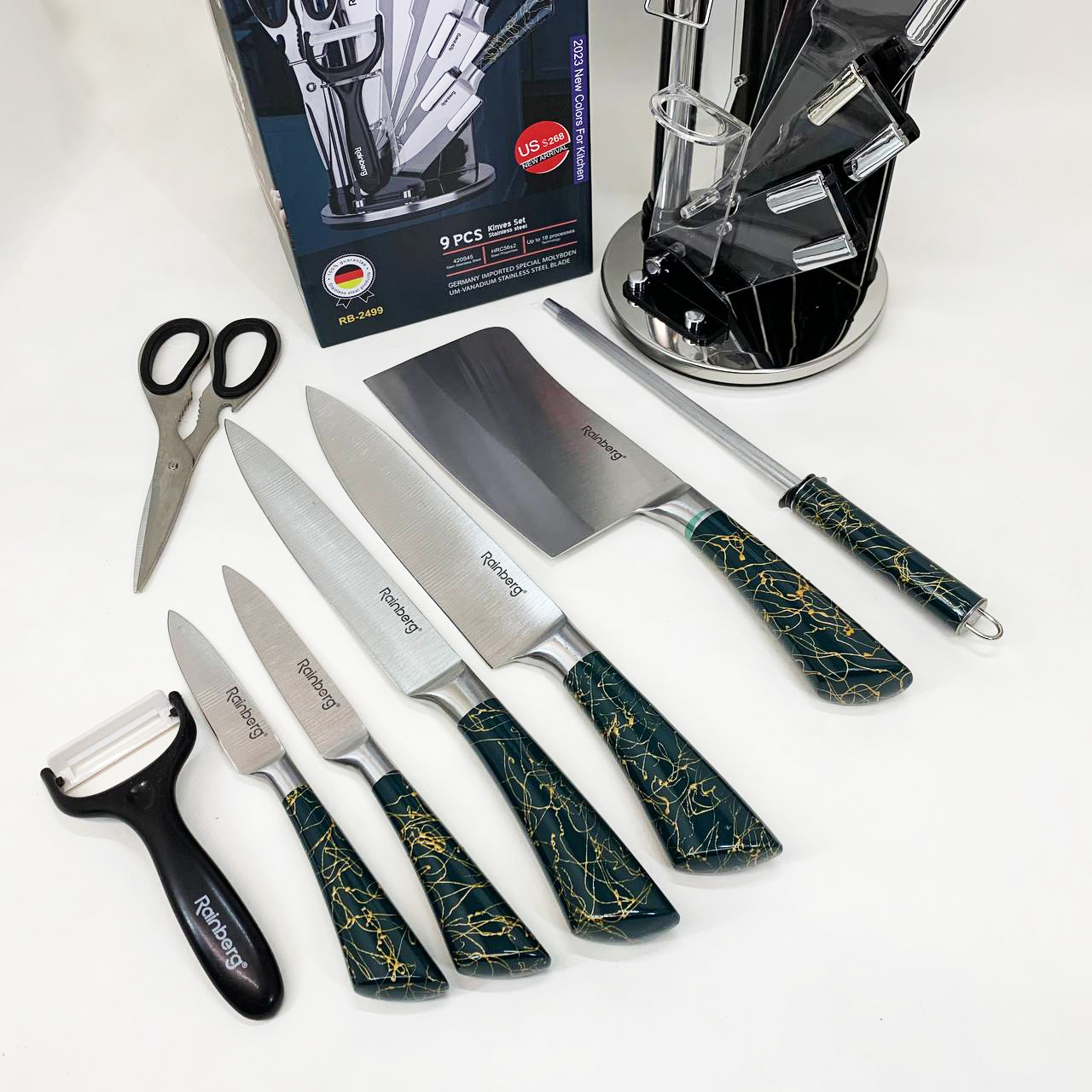 Набір кухонних ножів Rainberg RB-2499 8 предметів на підставці, що обертається Green