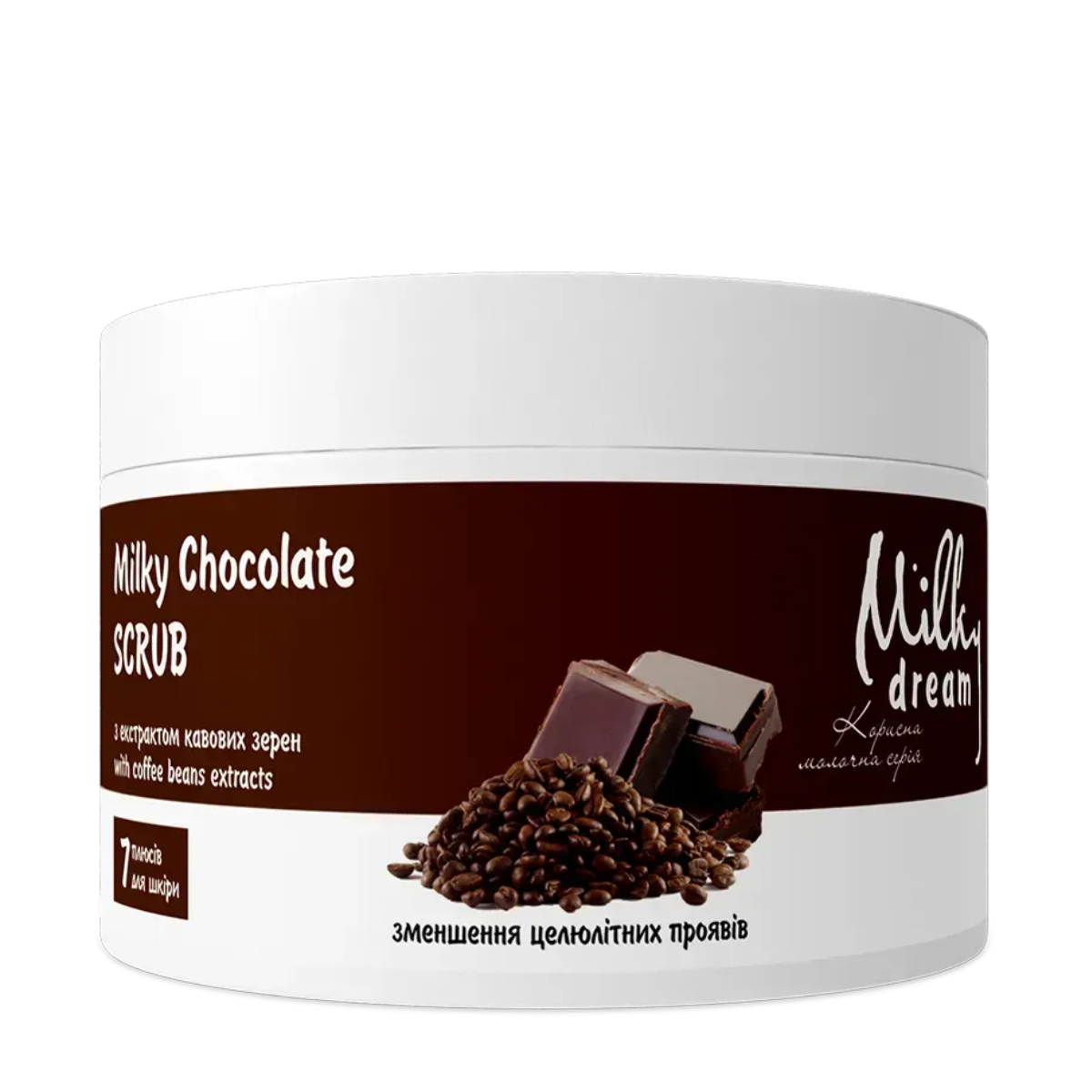 Антицелюлітний скраб для тіла Milky Dream "Молочно-шоколадний" з екстарктом кавиМолочно-шоколадний скраб для тіла Milky Dream — це ароматне поєднання догляду та насолоди, яке м’яко відлущує шкіру, покращує її тонус і надає шовковистості. Завдяки натуральним абразивам солі та цукру, живильним компонентам засіб підходить для щоденного SPA-догляду вдома.Основні властивостіЯк працює:делікатно відлущує ороговілі клітини;
