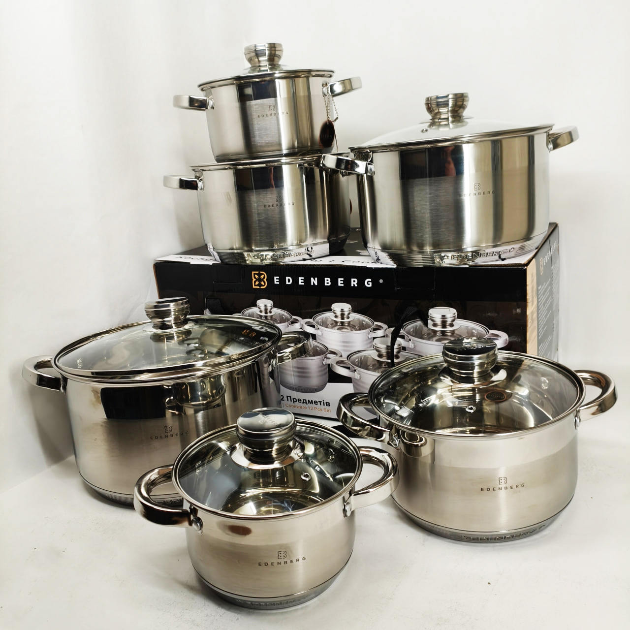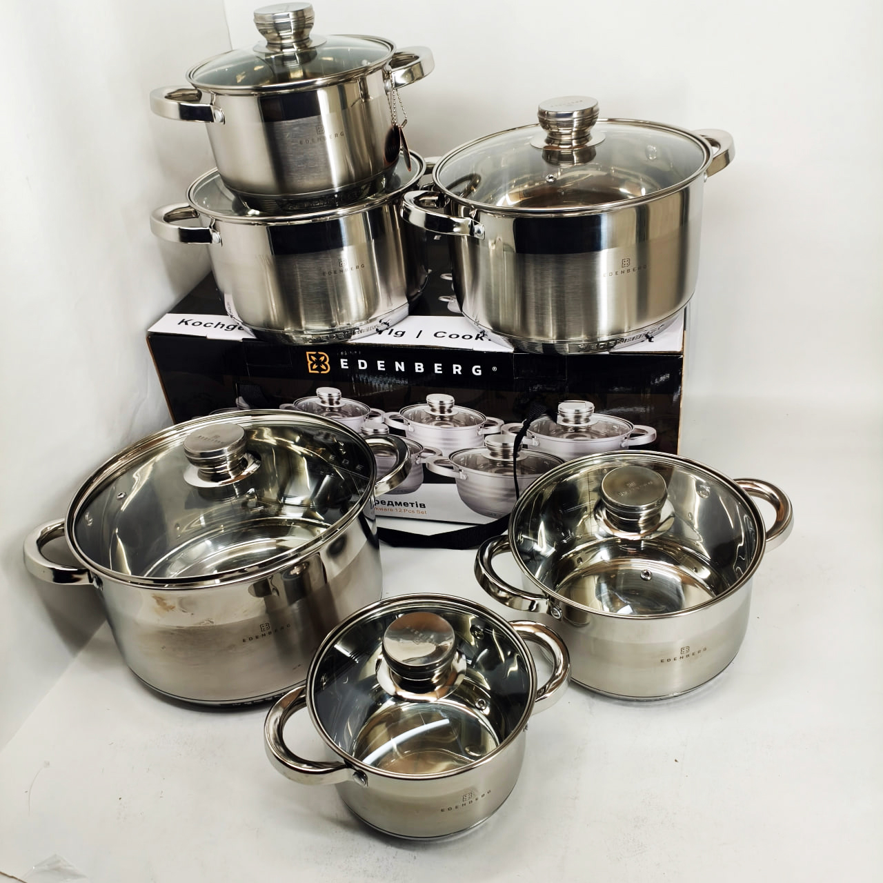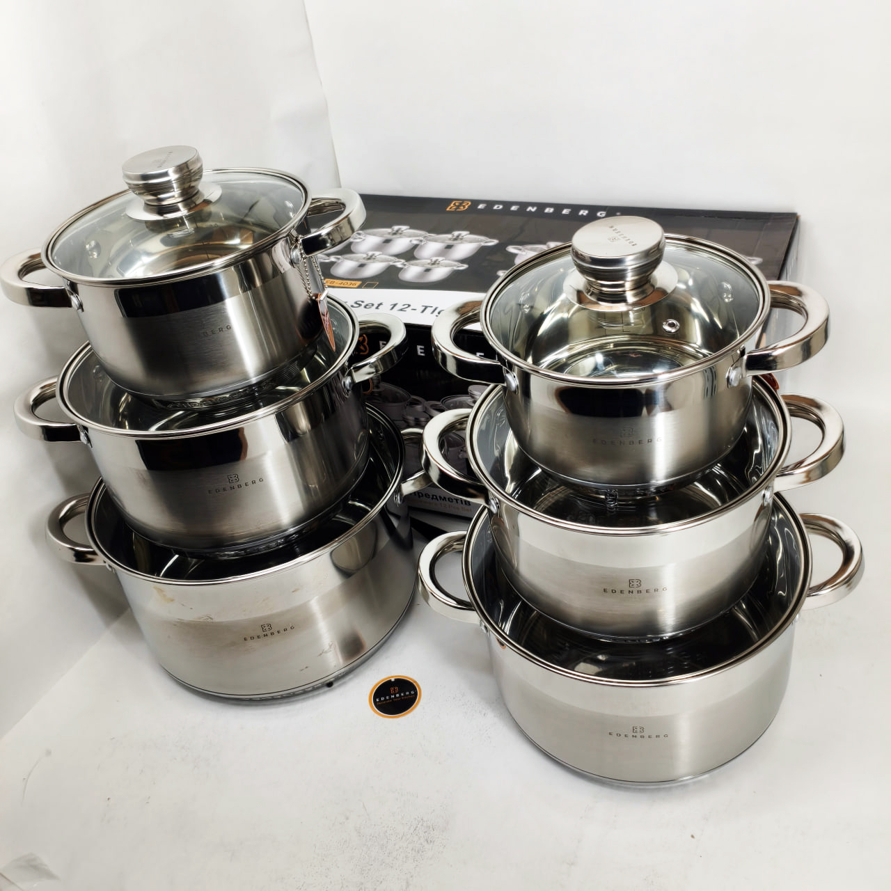 Набір каструль із сталі Edenberg EB-4036 12шт 2.1л–7.5л, 5-шарове капсульне дно, клепані ручки, індукція