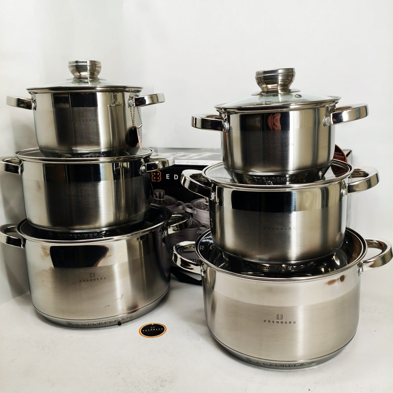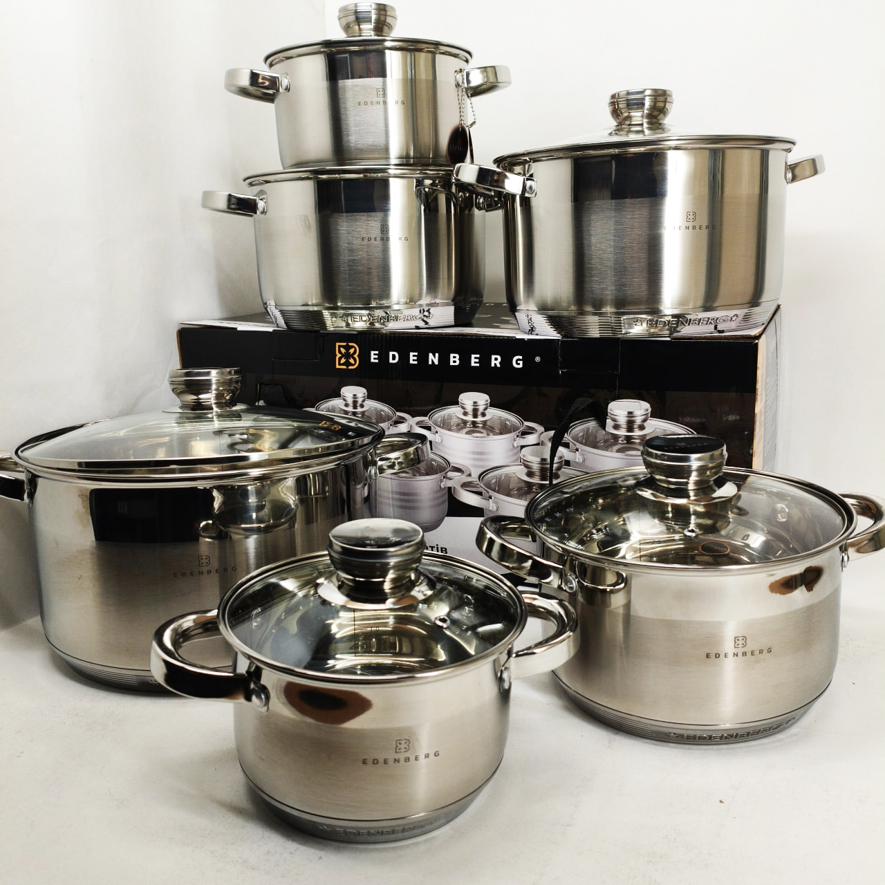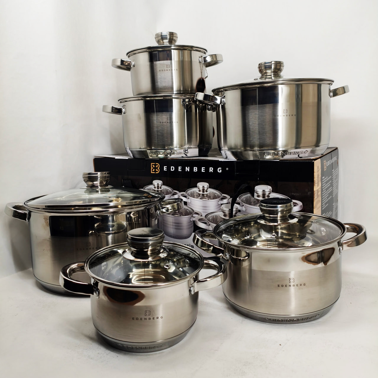 Набір каструль із сталі Edenberg EB-4036 12шт 2.1л–7.5л, 5-шарове капсульне дно, клепані ручки, індукція