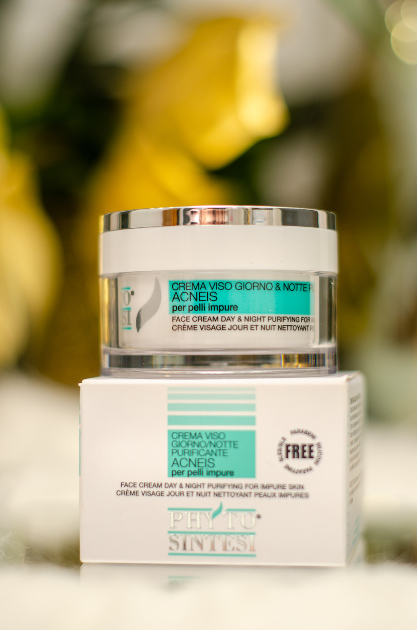 Денний та нічний очищуючий крем для обличчя (Day & Night Purifying Face Cream)Phyto Sintesi Face Cream Day & Night PurifyingАктивні компоненти:• Екстракти чебрецю, грейпфрута, лопуха – регулюють жирність, зменшують запалення.• Саліцилова кислота – очищує пори, вирівнює текстуру шкіри.• Вітаміни А і Е – антиоксиданти, захищають та відновлюють шкіру.Підходить для:• Жирної, комбінованої та проблемної шкіри.• Зрілої шкіри з акне або висипаннями.• Підліткової шкіри з тенденцією до висипань.Вирішує проблеми:• Жирність шкіри та розширені пори.• Висипання та запалення.• Нерівний тон і текстура.Рекомендації до використання:Наносити вранці та ввечері на очищену шкіру обличчя легкими круговими рухами до повного вбирання.Резюме:Цей крем забезпечує комплексний догляд за проблемною шкірою: очищує, матує та допомагає боротися із запаленнями. Ідеальний вибір для жирної та комбінованої шкіри.Термін придатності:Дата виробництва та кінцевий термін використання зашифровані у batch-коді (відповідно до вимог виробника та чинного законодавства ЄС). Продукція закуповується нами напряму з фабрики офіційно, тому додаткові дати не вказуються.Ми контролюємо свіжість поставок: на момент продажу засоби мають не менше 24 місяців до завершення терміну зберігання.Термін використання після відкриття — 6 або 12 місяців (залежно від продукту, зазначено на упаковці у вигляді символу відкритої баночки).