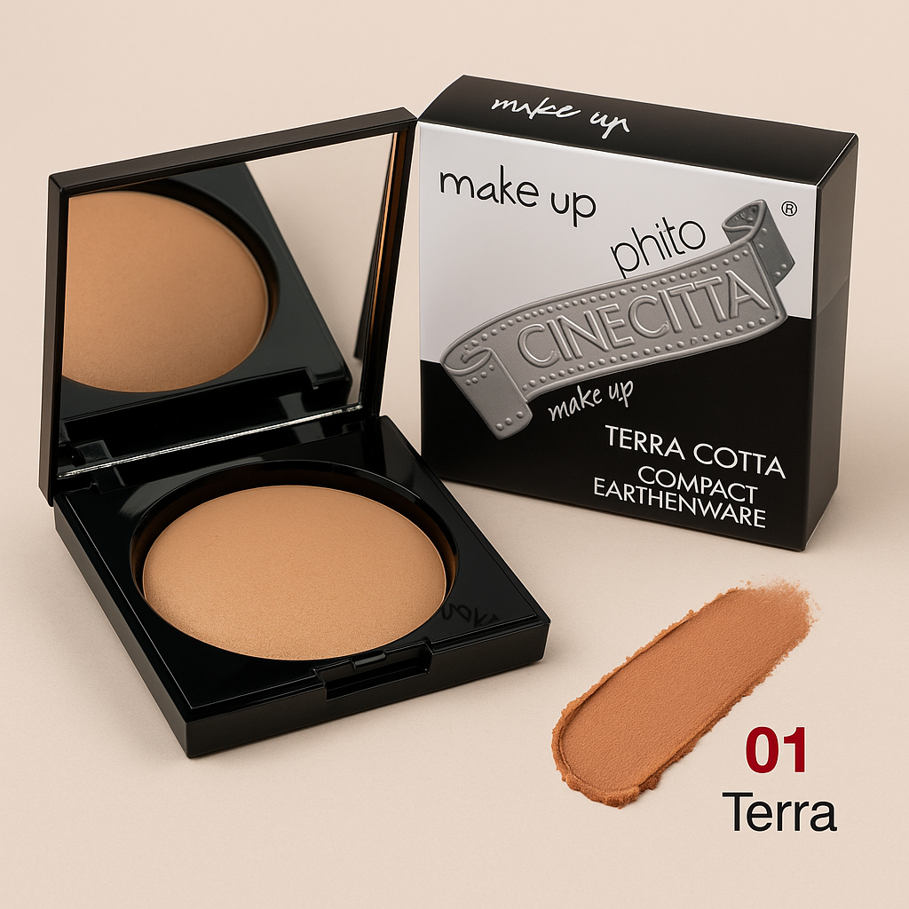 Запечена глина-коктор.CINECITTA Terra cota.Застосовуэться для моделювання (скульптурування) форми обличчя, носа. Завдяки широкій колірній гамі (10 кольорів), може застосовуватися як професійно, так і для домашнього застосувати. Дає дуже модний ефект «впалих» голівудських скул. Завдяки запіканню в печі під час виробництва, дуже легко лягає і не має терміну придатності. Незамінний для створення ефекту засмаги, надає шкірі приємний колір зі здоровим атласним блиском. Випускається в елегантній чорній коробочці з дзеркалом. Для зручності візажистів представлений в палітрі з 9 кольорів.