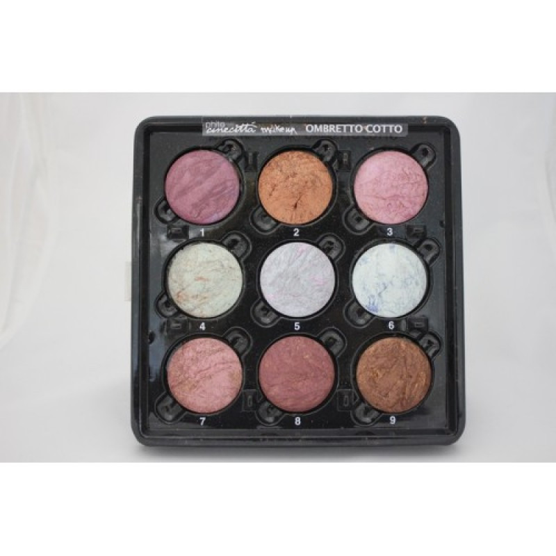 Палітра обпалених тіней Ombretto Cotto. 27 відтінків. Яскраві, перламутрові відтінки. Для отримання насиченого кольору наноситься вологою пензлем. Можна застосовувати в якості різнобарвною повідці (стрілки). Для зручності клієнтів представлені в одиничної упаковці.