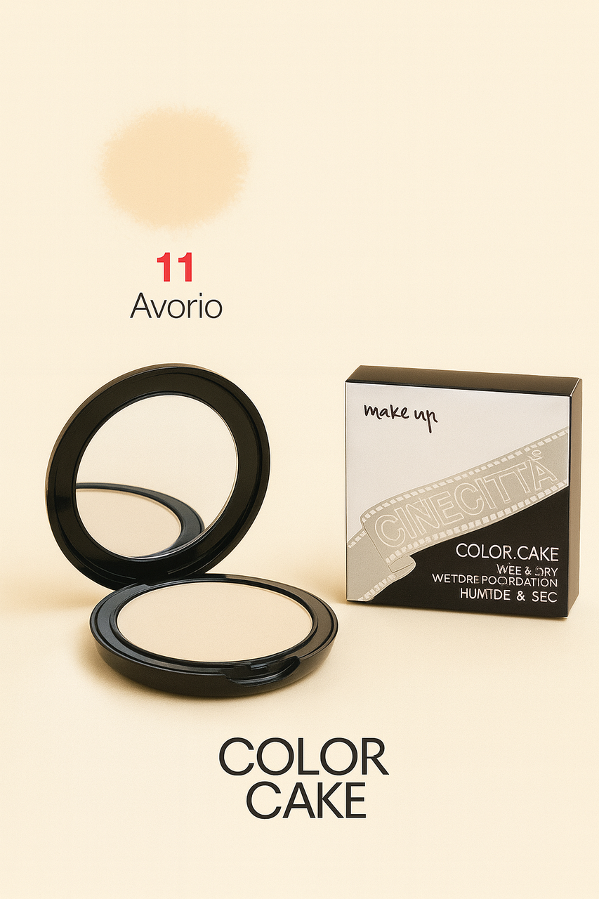 Тон пудра 2 в 1 CINECITTA Color Cake.Випускається в 12 відтінках. Покриваюча здатність від 30 до 60% .У сухому вигляді працює як щільна пудра і наноситься пензлем. При використанні вологим спонжем працює як тональна основа і не вимагає закріплення пудрою. Не рекомендується для дуже сухої і зрілої шкіри.