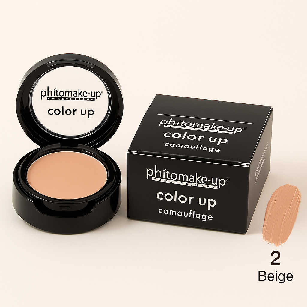 Тон PHITOMAKE-UP «камуфляж» Color up.Свою назву отримав завдяки унікальній здатності приховувати будь-які дефекти на поверхні шкіри (веснянки, пігментні плями, прищі і т.д). Покриваюча здатність до 100%. Щільний тонуючий засіб ідеально підходить для фото і відео зйомок. Витримує температуру до 35 градусів. Якщо необхідно отримати ефект «живоъ» сяючої шкіри, рекомендується застосовувати без пудри. Для закріплення і найбільшої стійкості варто застосовувати разом з фіксуючою пудрою №701, набиваючи її за допомогою пушку поверх камуфляжу. Засіб не містить ароматів і ароматизаторів, для того, щоб не викликати алергічну реакцію навіть на самій проблемній шкірі, тому має запах, що нагадує запах театрального гриму, який зникає через кілька хвилин після нанесення. Цей щільний маскуючий засіб чудово поєднується з базою під макіяж або з менш щільним тоном, якщо необхідно зменшити його щільність.Випускається в пластикових «шайбах» 30мл. Для зручності візажистів так само випускається в палітрах по 9 шт.