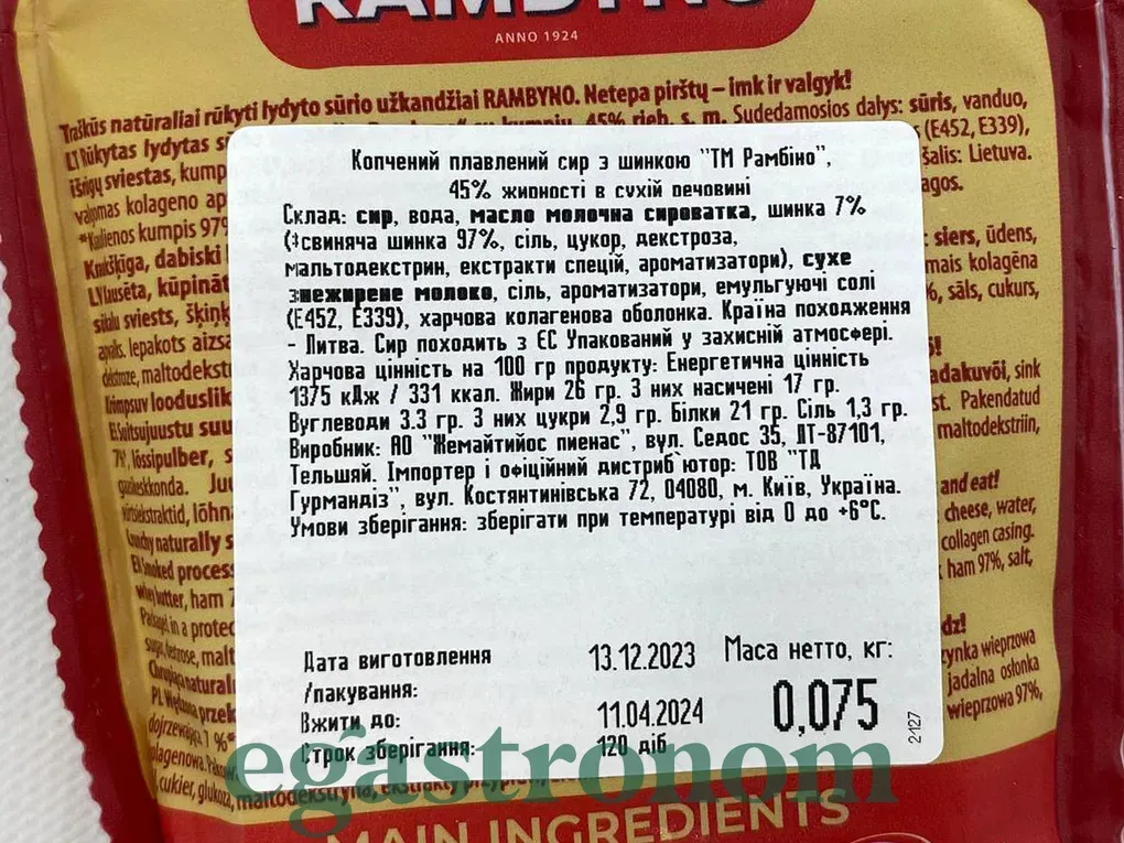 Сир копчений з шинкою Рамбіно Rambyno ham 75g 10шт/ящ