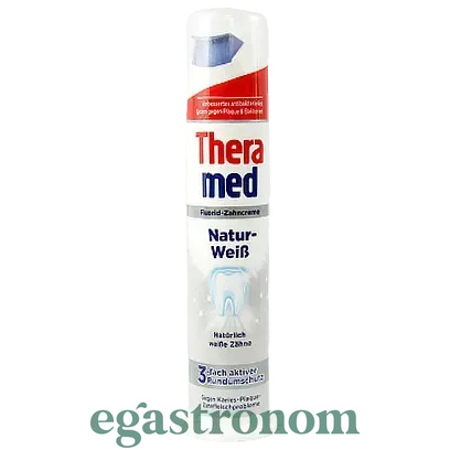 До складу зубної пасти Theramed Natur-Weiß (натуральна біла посмішка) входять мікрокристали, які дбайливо полірують емаль і відновлюють їх природну білизну. У складі пасти є фтор який запобіжить карієс, зубний наліт і зубний камінь. Зубна паста Theramed Natur-Weiss знищує поганий запах з рота і запобігає його появу. ТОП запити Засоби для прання Вивідник плям Горішки купити Купити крупи онлайн Варення купити Купити засіб для чищення автомобіля Замовити капсули для прання