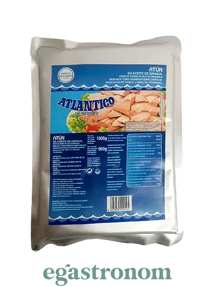 Невеликі рівні шматочки консервованого м'яса тунця знаходяться в невеликому вмісті олії, яке зберігає смак і захищає від висихання. Тунець Atun Atlantico упакований в щільний, герметичний пакет з міцної фольги, яка не пропускає повітря, а також захищає продукт від сонця. Зручна упаковка вміщує 950 грам м'яса тунця і 50 грам масла. Такого обсягу достатньо, щоб приготувати ряд страв для масштабного банкету. Кількість на палеті: 864 шт (54 ящ.)