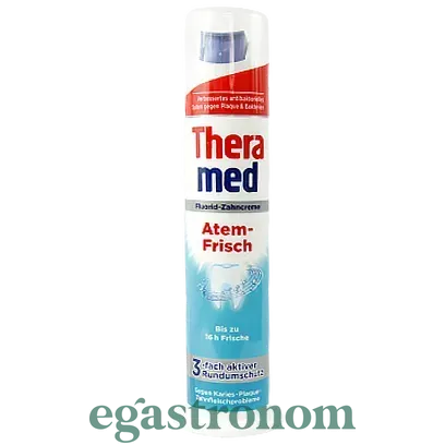 Зубна паста з дозатором. Обсяг—100 мл. Theramed Atem Frisch для надання свіжості в роті. Видаляє надовго неприємний запах. Нейтралізує кислоту, що руйнує зубну емаль, видаляє мікроби. Підходить для щоденного використання ТОП запити Підгузки купити Сир твердий купити Сир витриманий Плавлені сирки ціна Імпортні солодощі Кава замовити Солодощі батончики