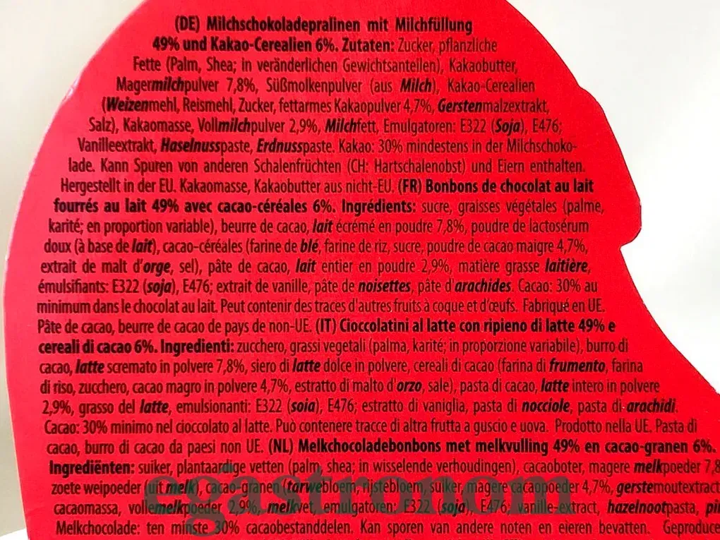 Смачні шоколадні цукерки, які вже своєю упаковкою налаштовують на різдвяний та святковий настрій. Цукерки виготовлені з молочного шоколаду з наповненням з молочного праліне з криспами з какао.