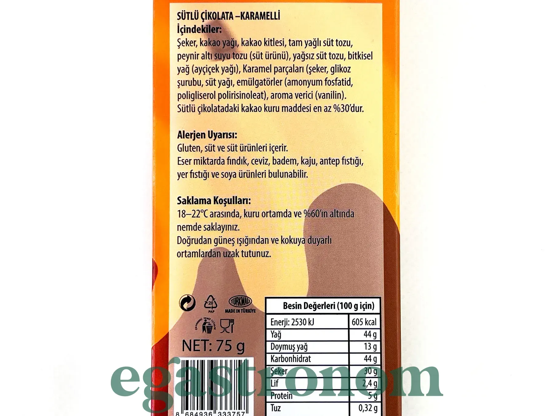 Молочний шоколад із яскравою карамельною начинкою. Дуже солодкий, ніжний та ідеальний до чаю чи як маленький подарунок.