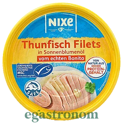 Консервований тунець Nixe у соняшниковій олії. Як відомо, тунець є дуже корисною та поживною рибою. Крім того, цей продукт має відмінні гастрономічні якості, завдяки чому користується величезною популярністю в багатьох країнах світу. М'ясо тунця багате більшим вмістом білків, ніж будь-яка інша риба, а також у ній міститься безліч вітамінів, таких як А, В1, В2, В6, В9, Е, РР, мікро- і макроелементів: кальцій, магній, натрій, калій, фосфор , хлор, сірка, йод, залізо, цинк, мідь, марганець, фтор, хром, нікель, кобальт, молібден. ТОП запити Напої Ціна олія Подушечки для прання Купити засіб для миття посуду Товары з європи Масло вершкове купити Плавлені сирки