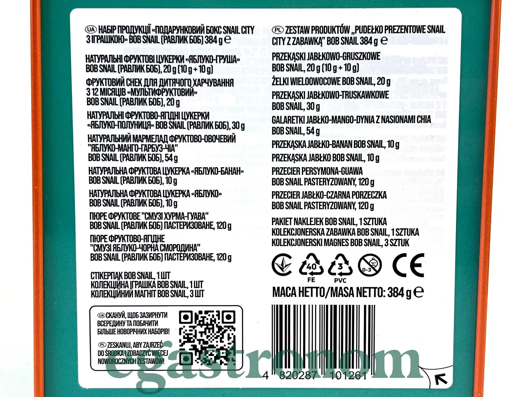 Яскравий святковий бокс у формі казкового будиночка Bob Snail — це готовий набір корисних фруктових перекусів без цукру, барвників і консервантів. Усередині — натуральні фруктові смужки, мармеладки, пюре та фруктові цукерки з яблуком, грушею, манго, бананом, чорною смородиною та хурмою. Додатковий бонус — іграшка, стікер та колекційні магніти.