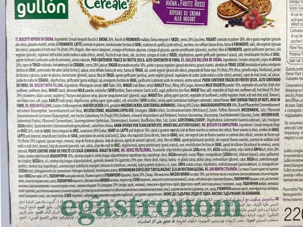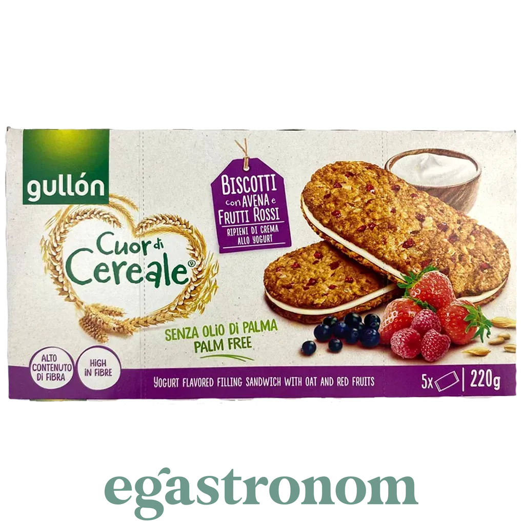 Набір хрусткого цільнозернового печива, виконаного у формі сендвічів. Продукт виготовлений на основі цільних злаків, ніжного молочного йогурту і добірних лісових ягід. Печеньe Gullon Vitalday Лісові ягоди & Йогурт володіє особливо хрусткою текстурою і насиченим ягідним смаком. ТОП запити Ціна горіхів Купити сир лазур Ціна вершкового масла Горгонзола Спеції та прянощі купити Замовити шампунь Ціни на побутову хімію