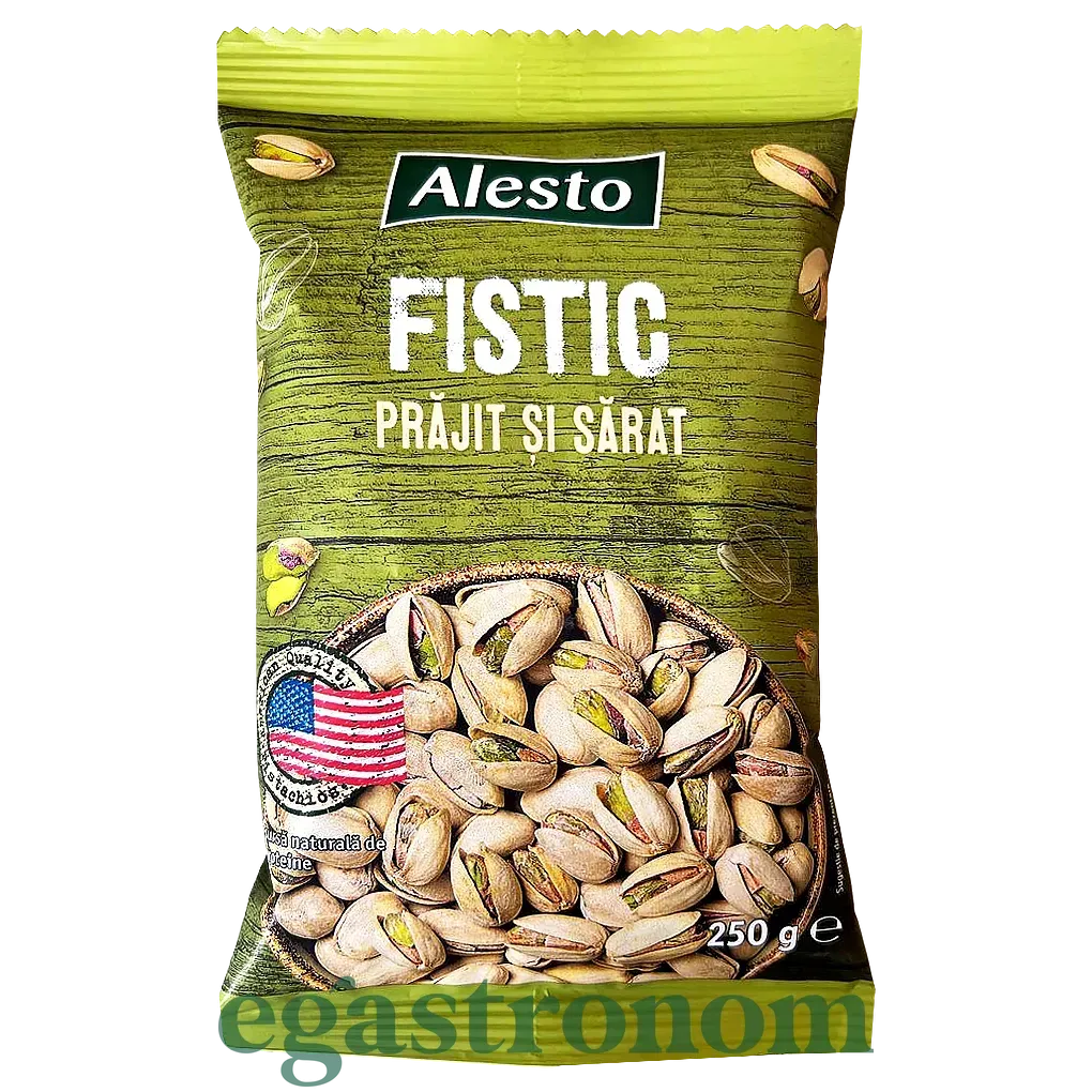 Фісташки Alesto - це якісний продукт, вироблений в Німеччині відповідно до європейських стандартів якості. Добірні каліфорнійські фісташки без зайвого сміття і шкарлупи. Каліфорнійскі фісташки відрізняються дуже великим розміром горіха, також при їх приготуванні використовується сухе обсмажування.
