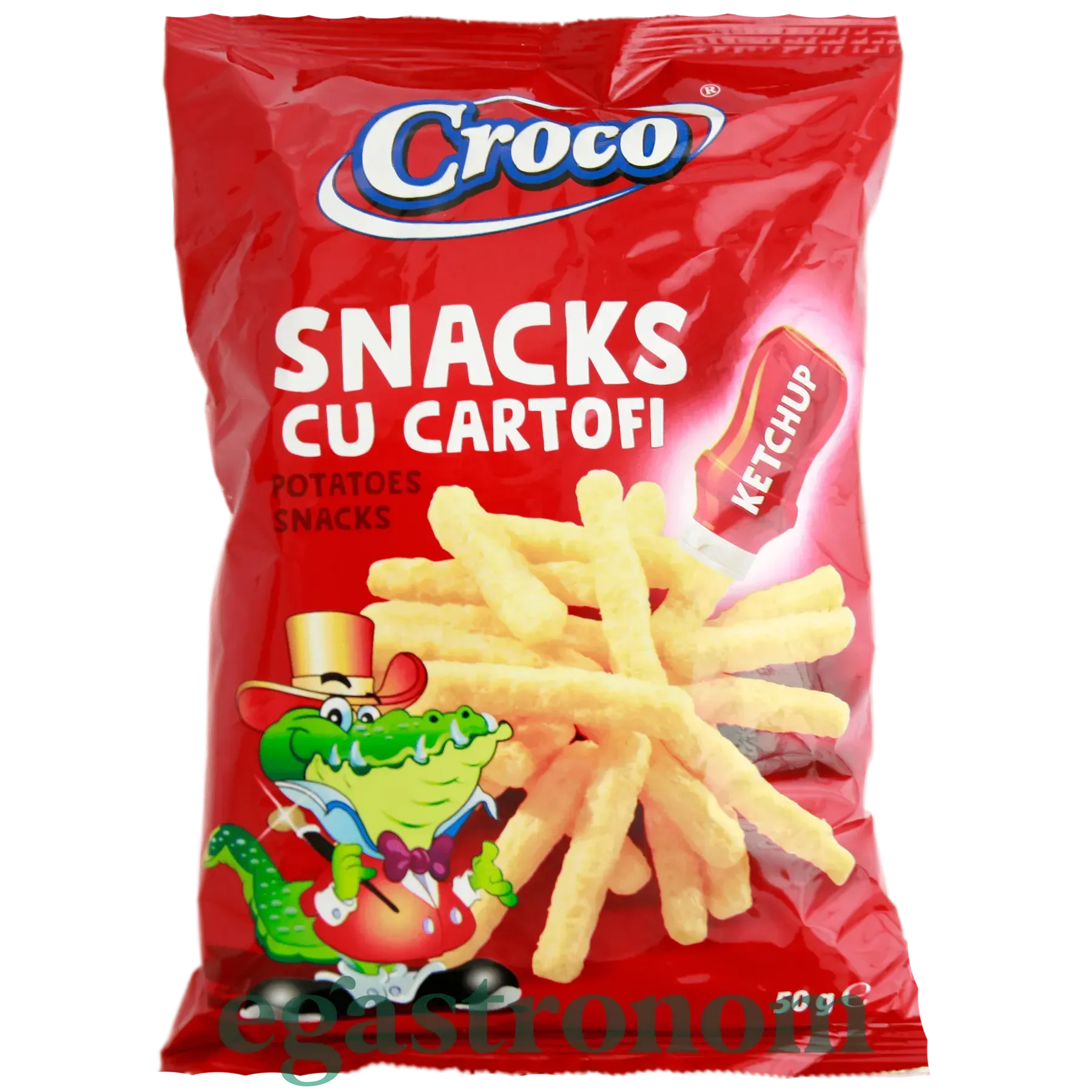 Croco з кетчупом - це смачна і хрумка закуска, що ідеально підходить для тих, хто любить солоні закуски. Ця закуска складається з картоплі, нарізаної тонкими смужками і обсмаженої до хрусткої золотистої скоринки. Пряно-солодкий смак і аромат кетчупу чудово поєднується з хрусткою картоплею, забезпечуючи чудовий смак закуски.