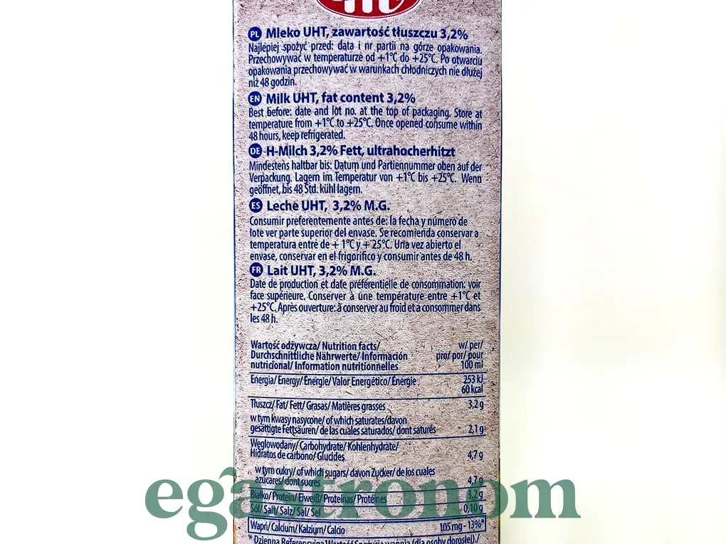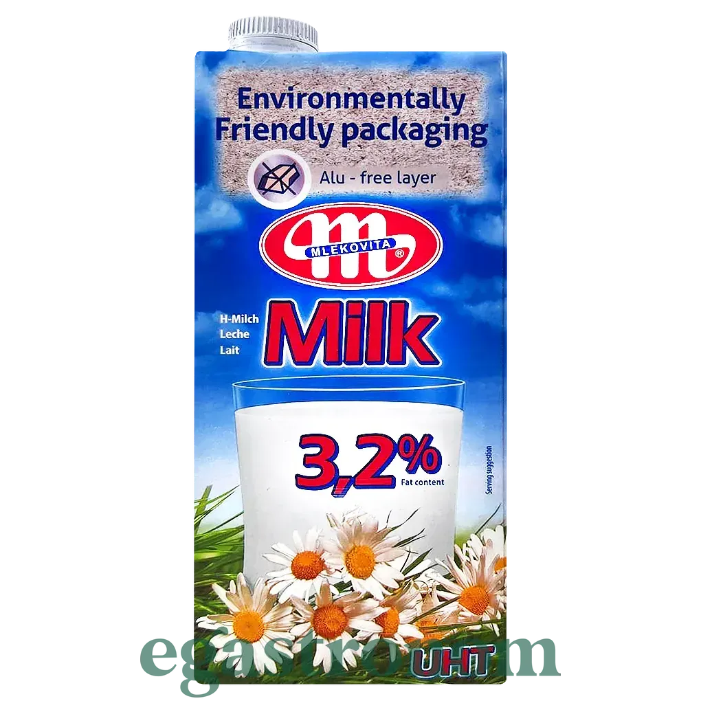 Молоко Млековіта, жирність 3.2%. Молоко найвищої харчової та біологічної якості. Унікальна, найсучасніша технологія виробництва забезпечує чудовий смак і в той самий час зберігає всі цінності натурального молока. Це найкраще джерело легкозасвоюваного кальцію, необхідного для здорових зубів і кісток. Інгредієнти: пастеризоване натуральне молоко жирністю 3.2% Зберігання: Зберігати при температурі нижче 25°С. Після відкриття упаковки зберігайте її в холодильнику не довше 48 годин. На палеті: 60ящ/720 шт