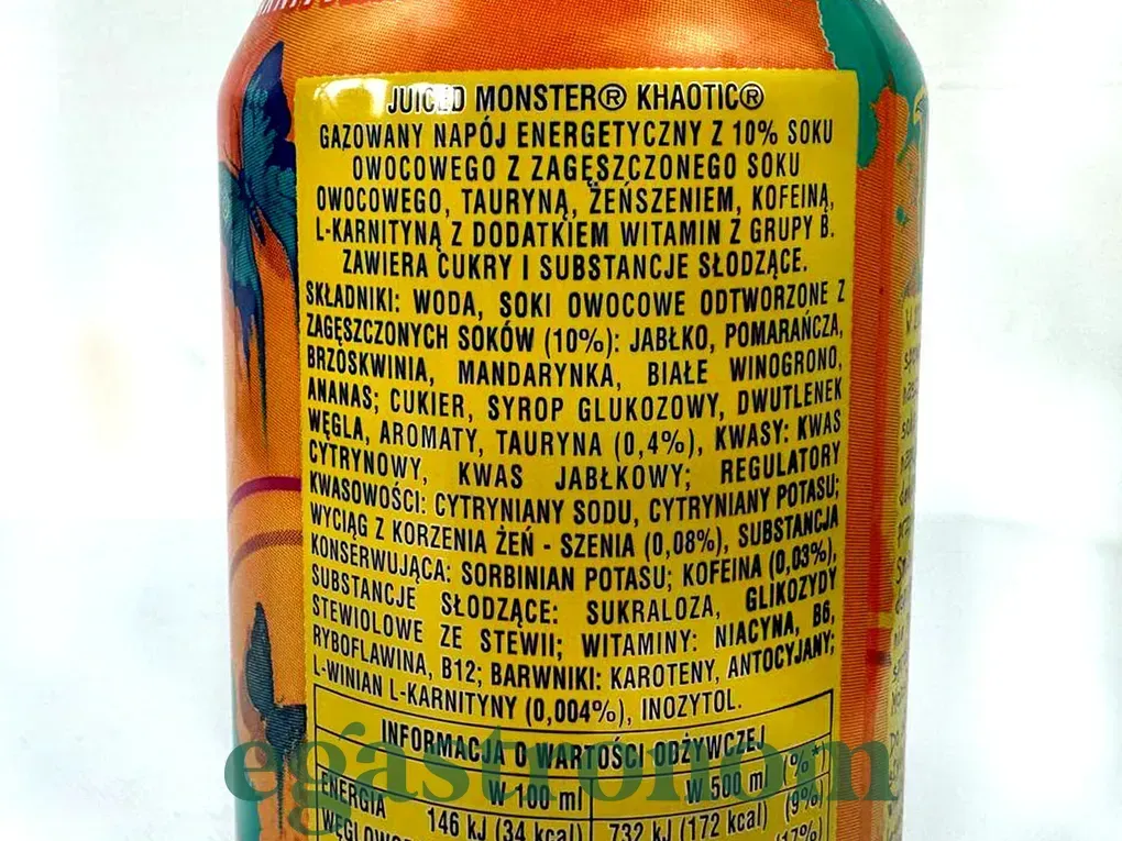 Енергійний напій Monster має насичений та м'який смак. Ідеальне поєднання правильних інгредієнтів у правильній пропорції, яку вміє робити саме Monster. Виготовляється на основі води, фруктових соків, цукру, сиропу глюкози, вуглекислого газу та інших компонентів. До складу напою входять кофеїн, деякі вітаміни групи В та карнітин. Безалкогольний газований напій із низьким вмістом цукру. Кількість на палеті: 1440 шт.