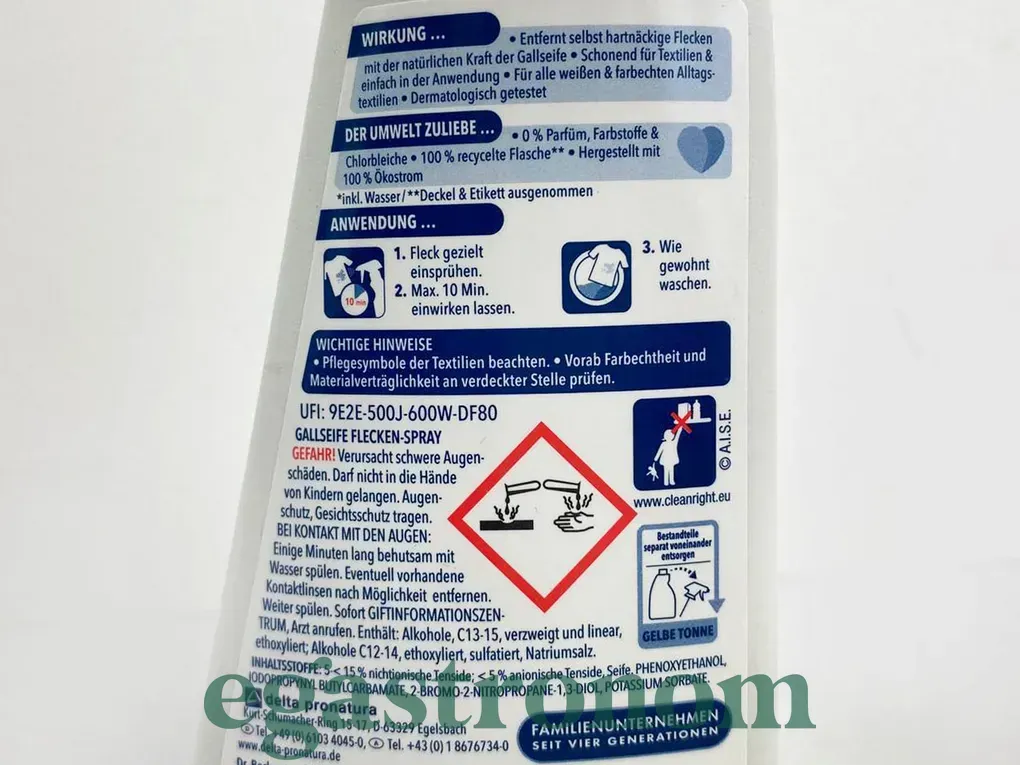 Засіб для виведення плям використовується перед пранням і видаляє забруднення на текстильних виробах, у тому числі і з делікатних тканин, таких як вовна чи шовк, не викликаючи вицвітання і зберігаючи яскравість кольорів, завдяки силі натурального мила , біоалкоголю, спеціальних активаторів, розпускаючих плями. Плями зникають навіть в коротких програм прання і у зимній воді, та кольори залишаються незмінними. Спосіб використання: збризкати пляму, залишити максимально на 5 хв, потім прати одяг у пральній машині як зазвичай. ТОП запити Ціна на олію Лазур Купити горіхи Купити соєвий соус Купити печиво Товари особистої гігієни Порошок пральний