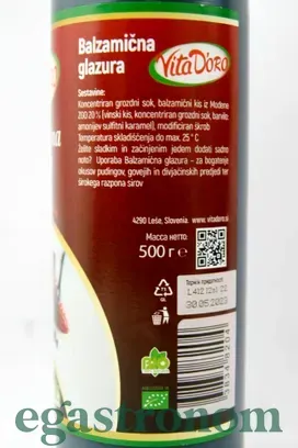 Соус бальзамічний ВітаДоро- це класичний бальзамічний крем. Витримується у спеціальних дерев'яних бочках, має густу консистенцію, зберігає смак класичного бальзамічного оцту, виготовляється на основі темних сортів винограду. Володіє приємним, унікальним тонким кисло-солодким фруктовим смаком і насиченим ароматом спілого винограду. Здатний привнести екзотику в самі звичні рецепти. Надає будь-якій страві особливий колорит. Це соус для справжніх гурманів. Бальзамічний соус додасть вишуканий смак овочевих салатів, м'яса на грилі, риби, фруктів і ягідних десертів.