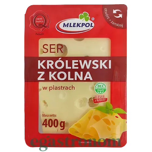 Чудовий жовтий сир швейцарського типу, виготовлений з найкращого молока. Вишуканий смак Królewski z Kolna - злегка солодкий з горіховою ноткою - задовільнить найвимогливіших гурманів. На палеті: 960 шт (48 ящ)
