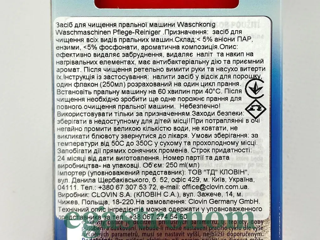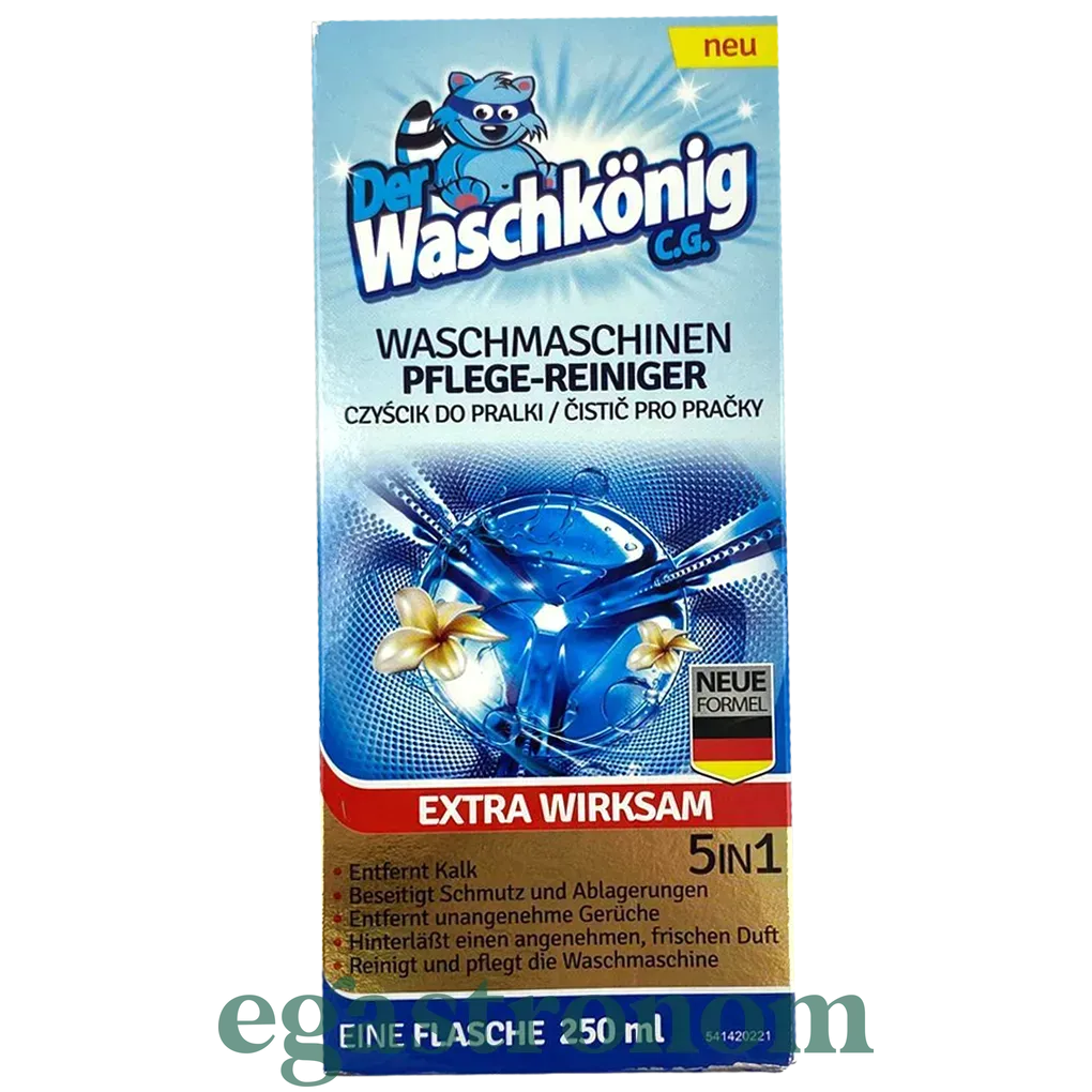 Очисний засіб для пральних машин — надзвичайно ефективний засіб, який дасть змогу відновити чистоту в пральній машині. Рідина допомагає видалити вапняний наліт, залишки мийних засобів і бруд зсередини пристрою, неабияк продовжуючи термін його експлуатації. Насамперед очисник Waschkonig дуже ефективний через його мийні властивості, які ніяк не завдають шкоди пральній машині. Він також очищає внутрішню частину пральної машини від бактерій, що запобігає появі неприємного запаху та має велике значення, коли з вами живуть діти або люди з ніжною та чутливою шкірою. ТОП запити Ополіскувачі для прання Заказати солодощі Моцарелла Рослинна олія купити Печиво ціни Соус песто Засіб для миття кухонних меблів