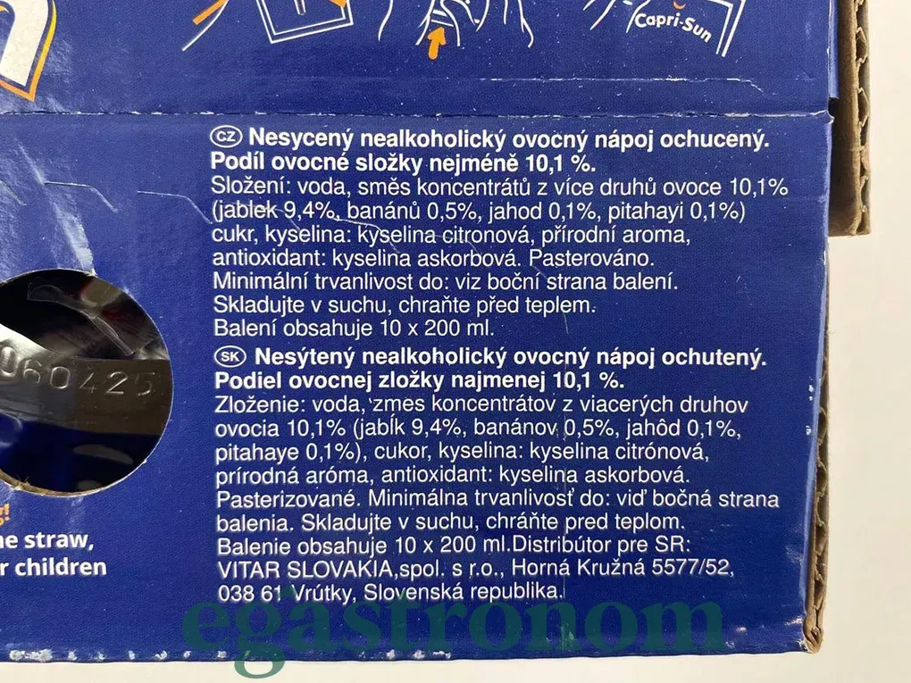 Сік з трубочкою Capri-Sun - натуральний, якісний, смачний напій. Містить сік з яблук, полуниці, бананів. Відмінний вибір на сьогоднішній день. В першу чергу хочемо звернути увагу на склад соку, де Ви знайдете тільки натуральні інгредієнти, що і вважається найважливішим чинником у досягненні кращих смакових якостей. Країна виробник Німеччина, що також свідчить про вищу якість напою. Компанія «Capri-Sun» має величезну популярність по всьому світу і радує своїми товарами на протязі більше 50 років. В одній упаковці знаходиться десять пачок соку по 200 мл .Вибирайте продукти від світових брендів, і Ви ніколи не помилитеся і не пошкодуєте. Кількість на палеті: 324 пач. ТОП запити Цукерки замовити Купити батончики Сир дорблю Сир крем чіз Купити желейки Замовити горіхи Ціна борошно
