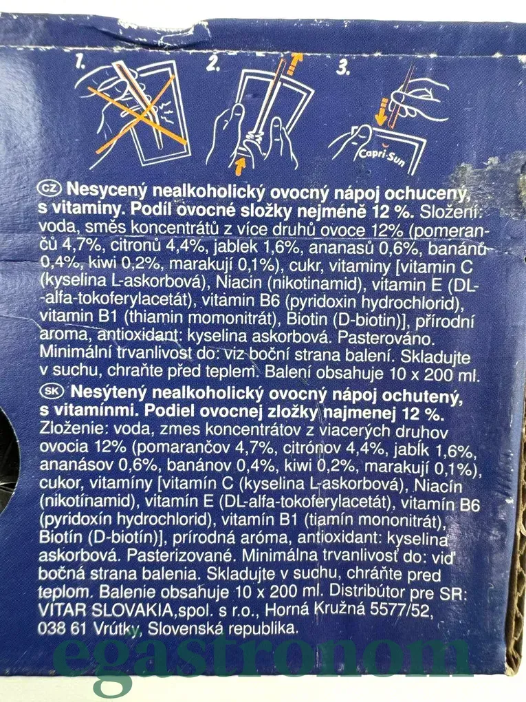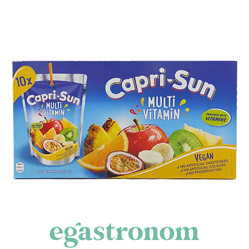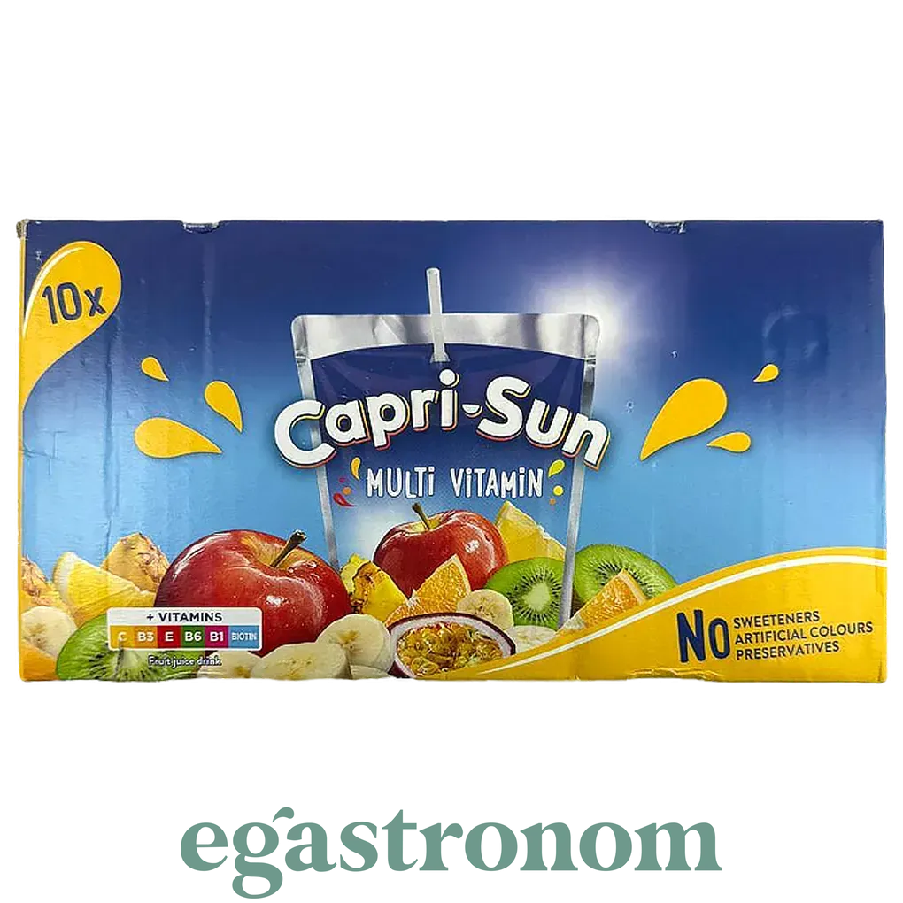 Сік Капрізон мультивітамін Capri Sun multi vitamin 10*200g 4пач/ящ - смачний фруктовий мікс в невеликому пакетику соку. Для зручності, до пакетику соку додається трубочка. Ідеально підходить для дітей і для дорослих. Напій без підсолоджувачів, штучних барвників і консервантів. Кількість на палеті: 324 пач. ТОП запити Солодощі батончики Молочни продукти Жувальні гумки Купити капсули для прання Засіб для чищення ванни Бакалія купити Вершкове масло ціна
