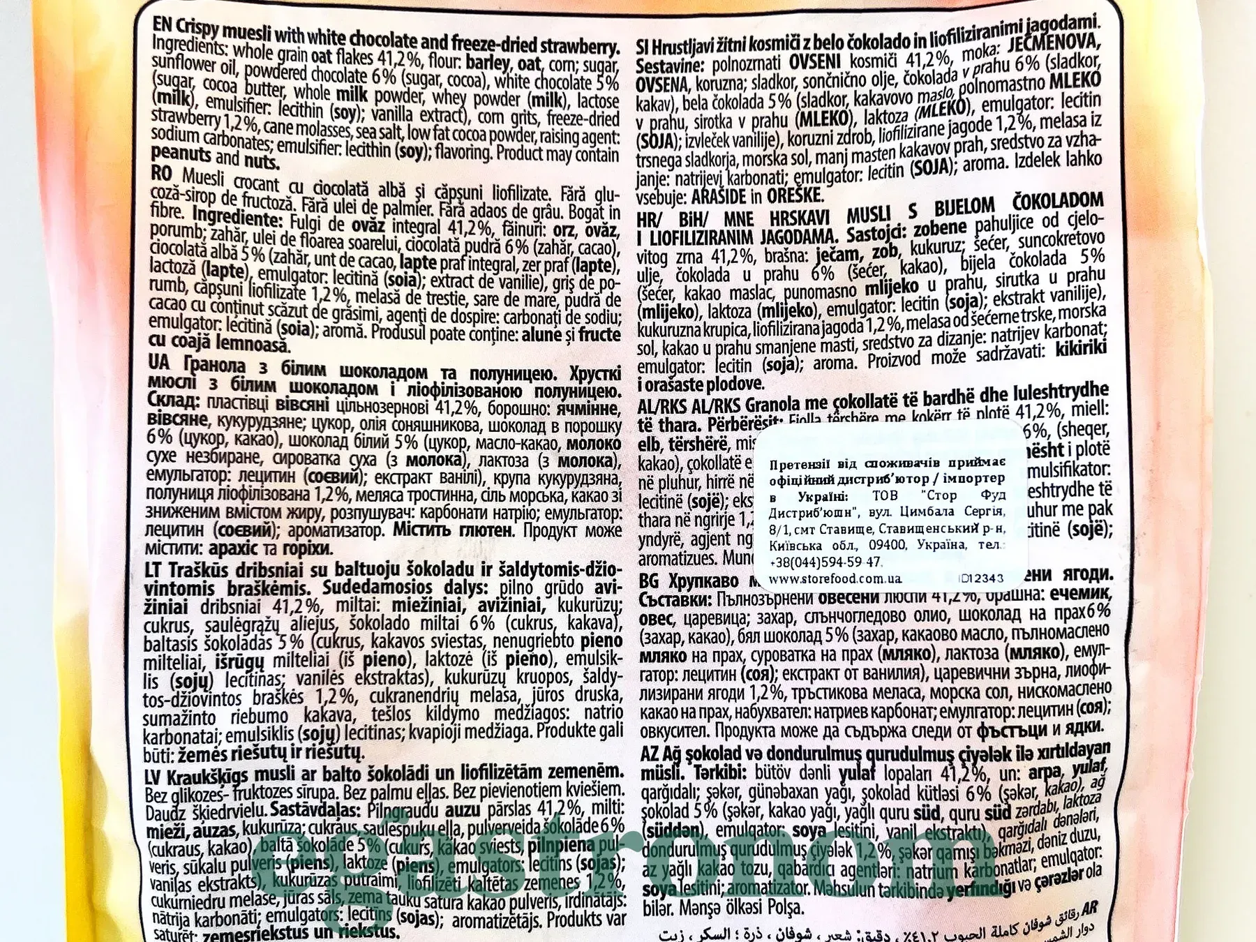 Хрусткі вівсяні пластівці з додаванням шматочків білого шоколаду та сублімованої полуниці. Джерело клітковини, без пальмової олії та без додавання глюкозо-фруктозного сиропу. Смачний і корисний вибір на сніданок чи перекус.