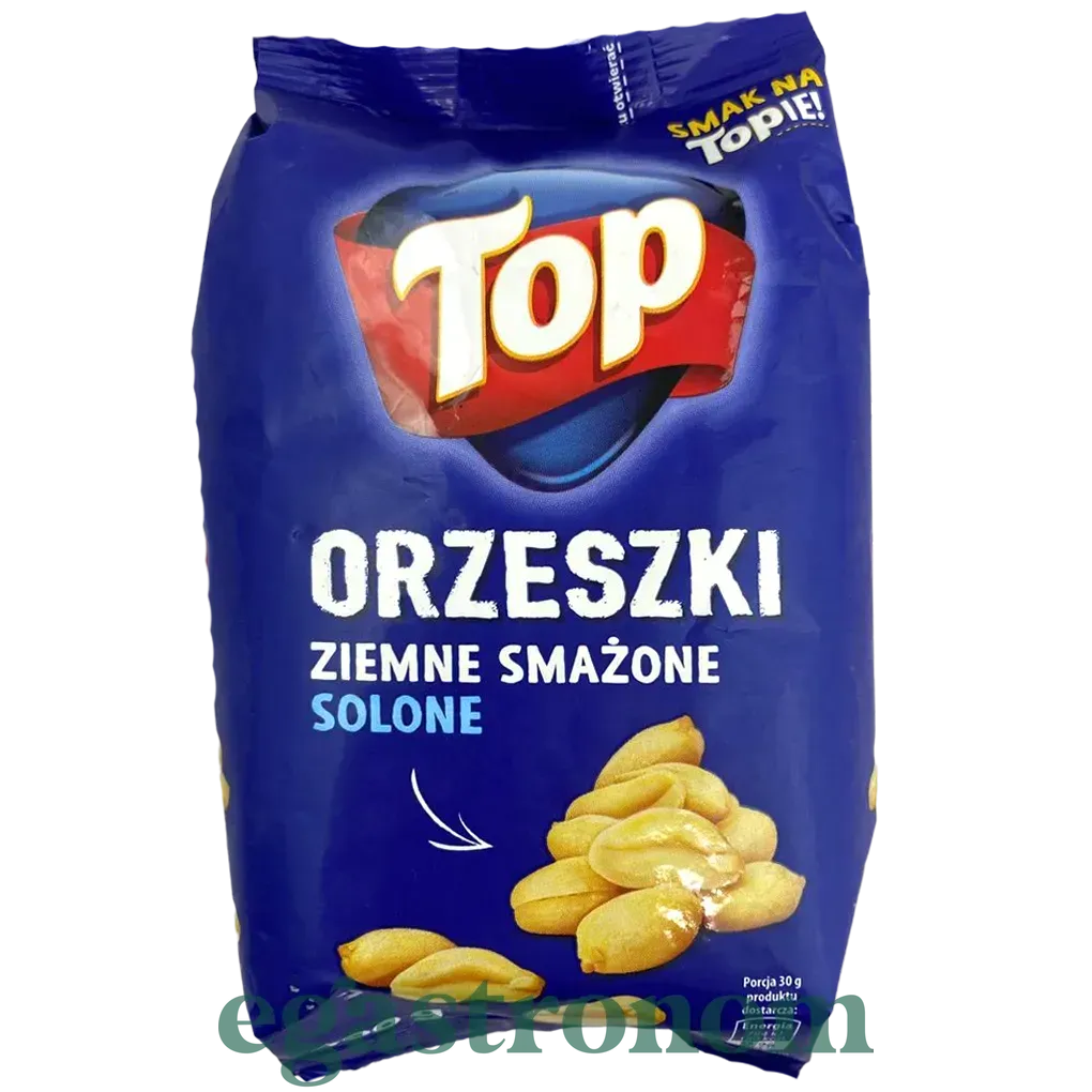 Арахіс Top - це арахіс, який обсмажується за індивідуальною рецептурою і спеціальними технологіями. Дуже смачна, хрустка і корисна закуска, є цінним джерелом поживних речовин, необхідних для людського організму. Арахіс Top Orzeszki проводиться з натуральної сировини. Що робить цей продукт максимально поживним і смачним.