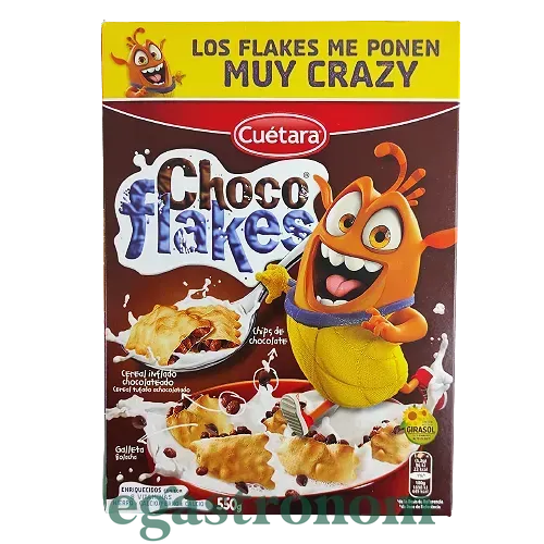 Сухий сніданок Cuetara Choco Flakes у вигляді подушечок з хрусткими кукурудзяними пластівцями всередині. Його їдять з молоком, кефіром і йогуртом. Містить вітаміни А, Д, Е, В1, В2, В3, залізо і кальцій.