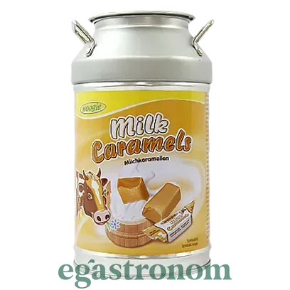 Цукерки Woogie Milk Caramels в металевій скарбничці Карамельні цукерки Woogie Milk Caramels в металевій банці-скарбничці у формі бідончика.