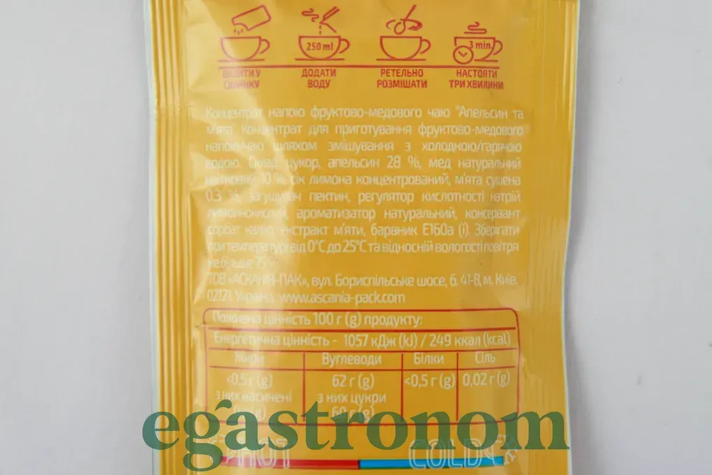Компанія Асканія пропонує чудовий варіант концентрованого натурального чаю "апельсин та м`ята" в сашетах, він джерело вітамінів і мінералів, які так необхідні організму в період застуд, для боротьби з вірусами. Чай можна швидко приготувати шляхом розбавлення гарячої або холодною водою, і насолоджуватися одночасно смачним і корисним напоєм. Гарячий чай прекрасно зігріє взимку і допоможе при застуді, а холодний варіант освіжить в літню спеку.