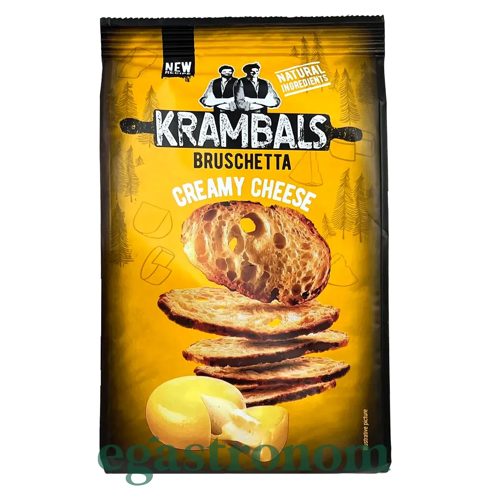 Хрумкі пшеничні брускети Krambals із насиченим вершково-сирним смаком. Ароматна приправа з ніжними молочними нотами робить ці брускети ідеальними для перекусу, аперитиву або подачі до соусів і сирних тарілок.