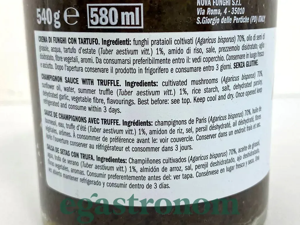 Трюфельний соус (трюфельний крем, трюфельна паста, трюфельна сальса) - це ідеальна приправа для перших, других страв, підсмаженого хліба, або омлету. Вміст трюфеля - 1%. Подається в якості закуски з різними сирами і для приготування брускетів. Чудово підходить для приготування гарячих і холодних страв, як соус для макаронних виробів, рису, м'ясних продуктів. Продукт готовий до застосування.