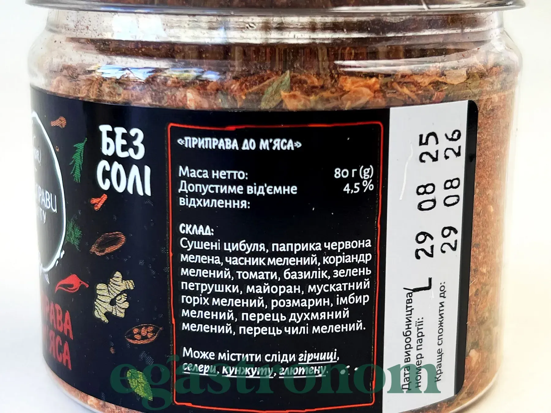 Натуральна приправа без солі для м’ясних страв — підсилює аромат, робить м’ясо соковитим і ніжним. Підходить для смаження, тушкування та запікання.