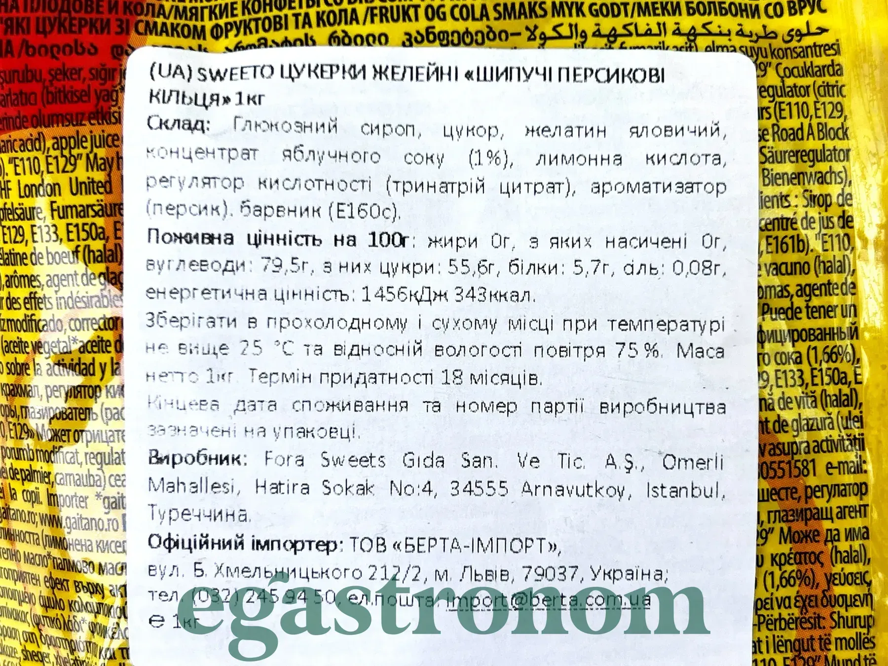 Цукерки желейні персикові кільця Світо Sweeto funny mix 1kg 12шт/ящ