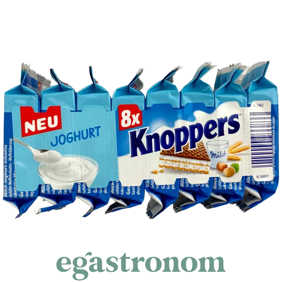 Вафлі Knoppers – це шоколадно-горіхові, повітряні вафлі, які мають три ніжних шари з різною начинкою. Вафля, покрита шоколадом, потім молочний крем, знову вафля, шоколадний крем з подрібненим фундуком і знову вафля. Все разом виходить дуже смачно: хрусткі вафлі, але не жорсткі, в міру солодко і дуже шоколадно