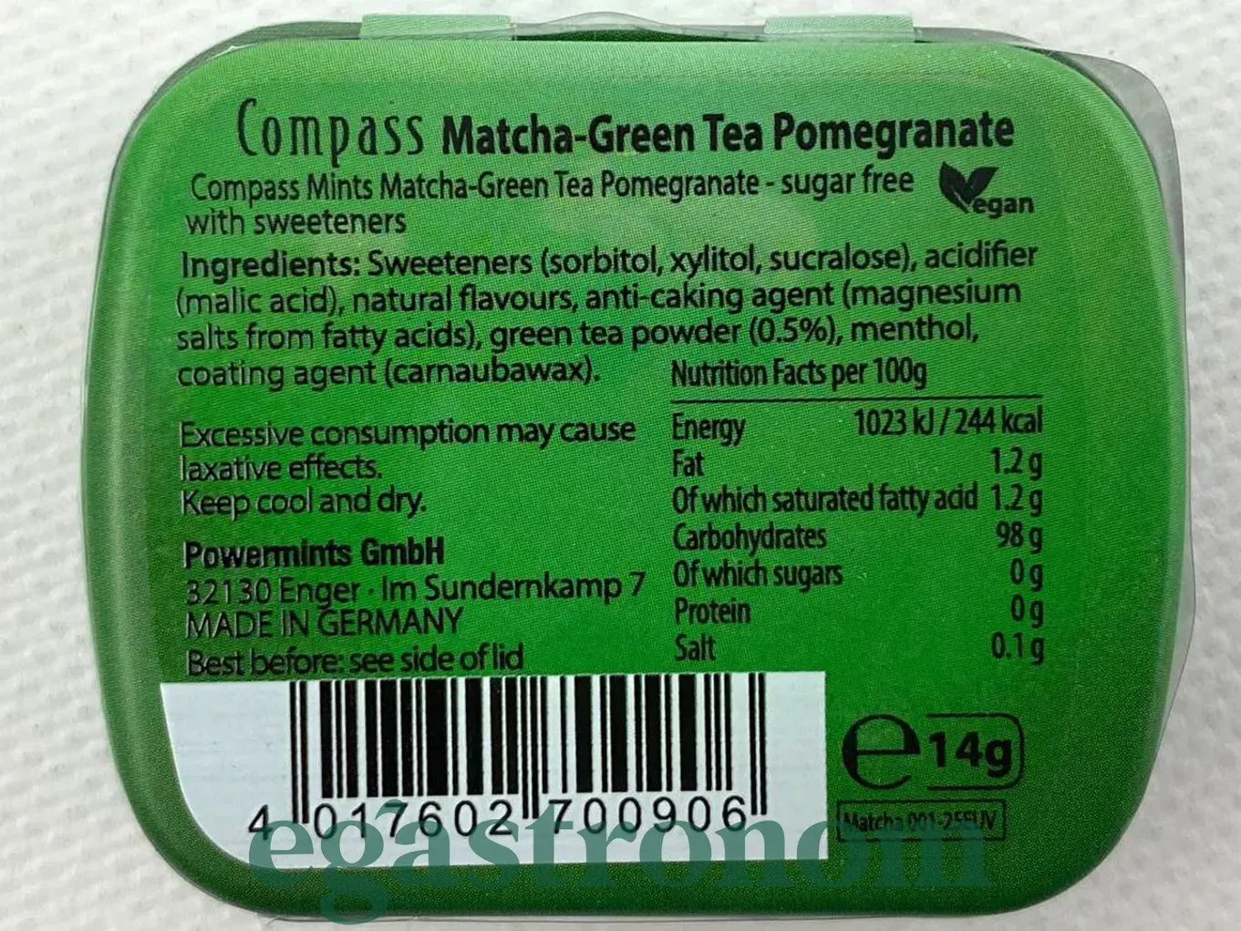 Компанія «Compass Pepper» успішно займає лідируючі позиції на світовому ринку, тому, роблячи свій вибір у бік їх продукції, Ви точно не помилитеся. На кондитерській фабриці використовуються виключно природні, високоякісні інгредієнти. Приємний аромат матча-чай-гранат так і буде вабити Вас спробувати цей льодяник. Завдяки невеликій баночці, Ви завжди можете носити з собою улюблені цукерки. Кондитерська фабрика знаходиться в Австрії.