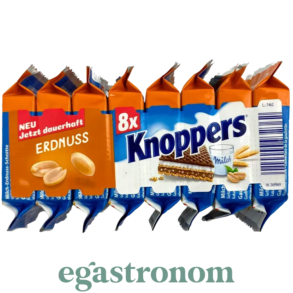 Вафлі Knoppers – це шоколадно-горіхові, повітряні вафлі, які мають три ніжних шари з різною начинкою. Вафля, покрита шоколадом, потім молочний крем, знову вафля, шоколадний крем з подрібненим арахісом і знову вафля. Все разом виходить дуже смачно: хрусткі вафлі, але не жорсткі, в міру солодко, ніжно і дуже шоколадно