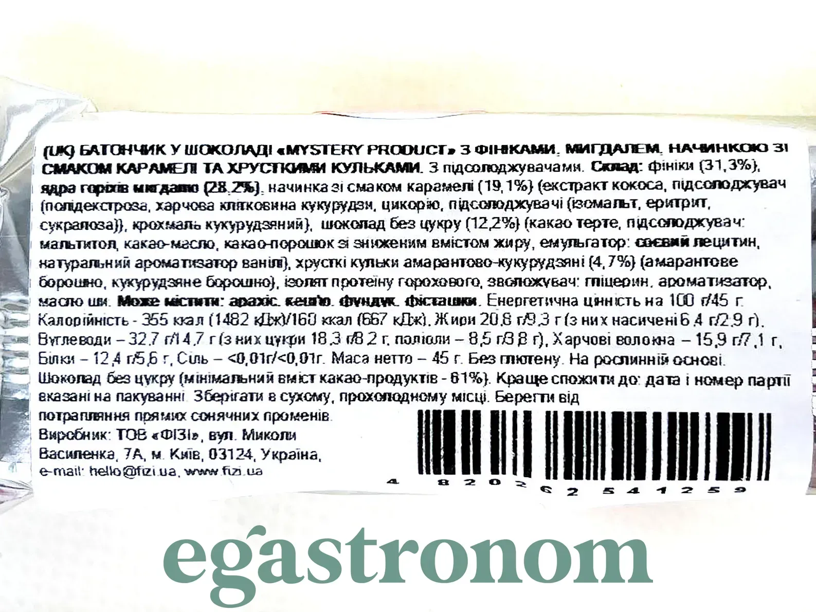 Оригінальний батончик Fizi Mystery Product — справжня гра зі смаком. Поєднання шоколаду, хрумких кульок, горіхів і карамельної начинки без доданого цукру. Спробуй і спробуй вгадати смак.