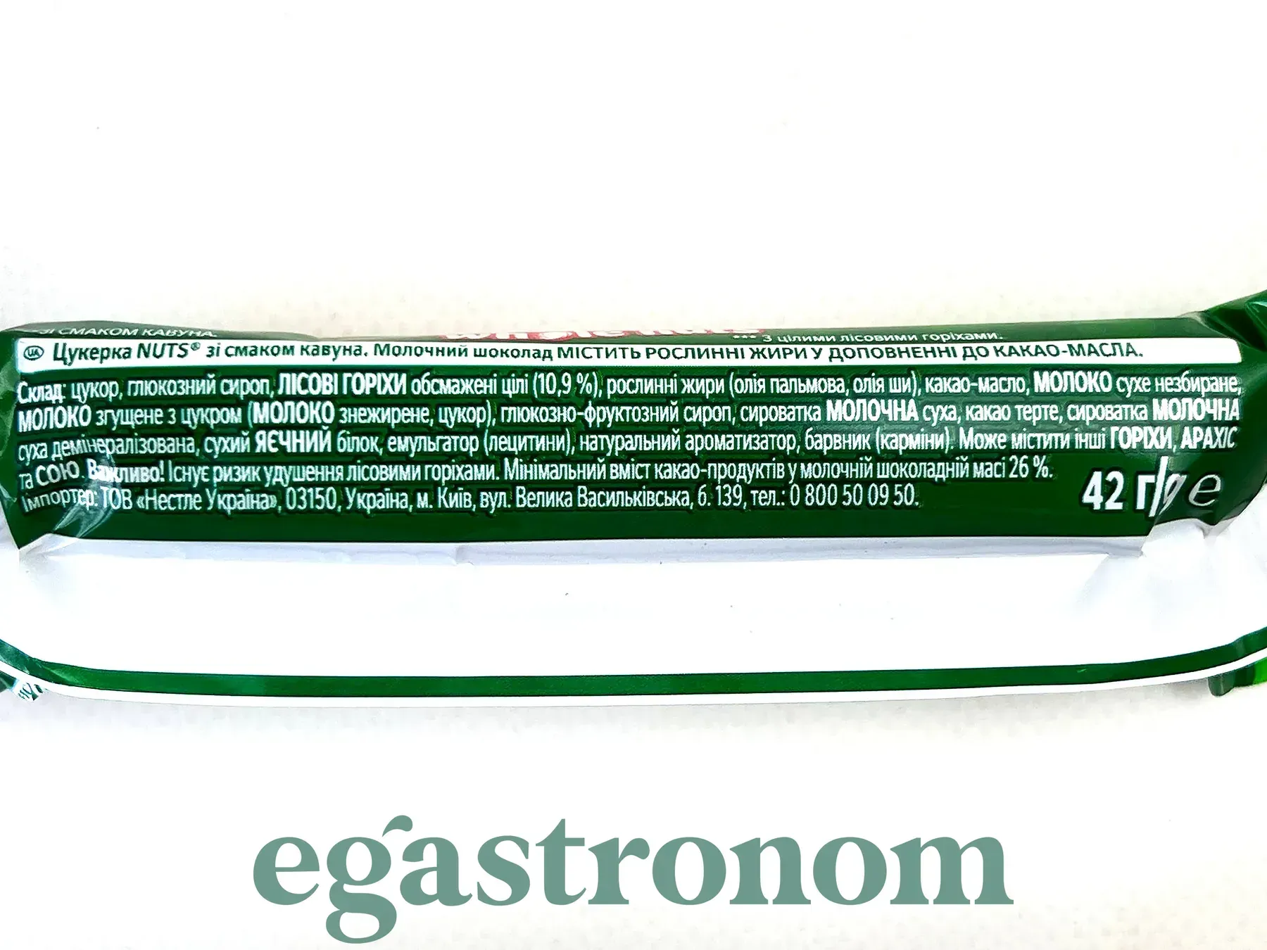 Батончик Nuts із неочікуваним літнім смаком кавуна. Поєднання ніжного молочного шоколаду, обсмажених лісових горіхів і фруктових нот створює освіжаючий смак і настрій сонячного дня. Ідеально підходить для перекусу або як солодкий енергетичний заряд.