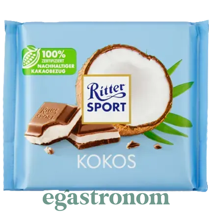 Молочний шоколад Ritter Sport Кокос 100г - На відміну від багатьох інших сортів RITTER SPORT, в цей шоколад замість цільних горіхів додають хрустку кокосову стружку, тим самим надаючи ніжному кокосово-молочному крему особливу екзотичну нотку. ТОП запити Купити тофу Вартість борошна Чіпси Засіб для чищення автомобіля Купити продукти з європи Твердий сир купити Господарське мило для прання