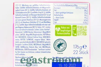 Цукерки з молока та альпійського молочного шоколаду щедро наповнені хрусткими кремами, цілими лісовими горіхами, мусом із темного шоколаду та освіжаючим йогуртовим кремом.