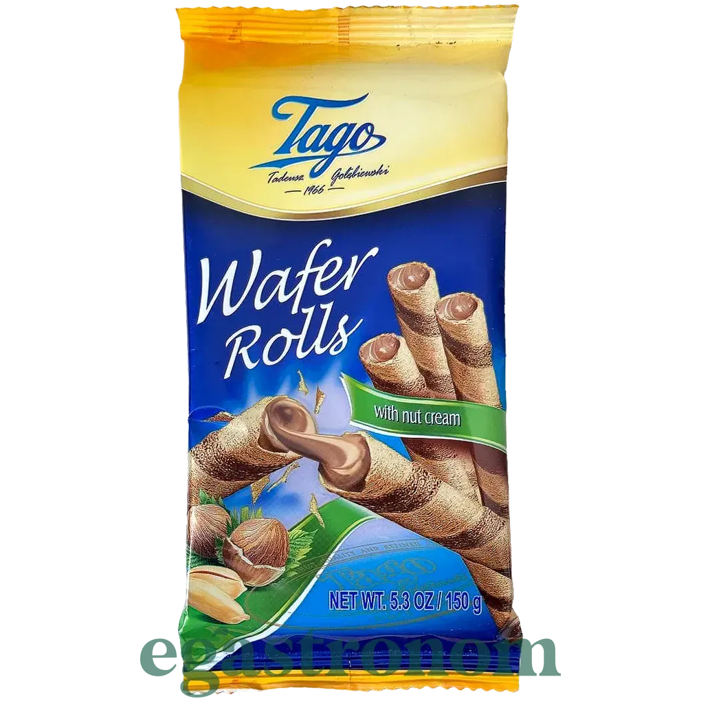 Вафельні трубочки з горіховим кремом Tago, 150 г — Смачні хрусткі трубочки, наповнені ніжним горіховим кремом. Ідеальні як солодкий перекус до кави, чаю або як десерт. Поєднання хрумкої вафлі та ніжної начинки створює вишуканий смак, що сподобається і дітям, і дорослим. Вироблено в Польщі.