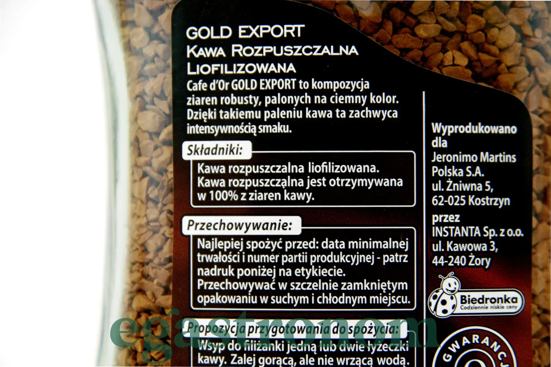 Кава Cafe d'Or gold export - це чудова гранульована кава, приготована по сучасних технологіях виробництва кави - сублімацією. При цьому кава зберігає кофеїн і більшість натуральних корисних речовин, а смак і аромат стають більш вираженими. Напій має м'який, але в той же час і міцний смак, не гірчить, багатогранний аромат і шоколадні відтінки в післясмаку. Cafe d'Or Gold прекрасно поєднується з молоком або вершками. ТОП запити Чеддер ціна Миючий засіб для ванної Оливки та маслини Варення купити Купити томатну пасту Шоколад ціна Мило ціна