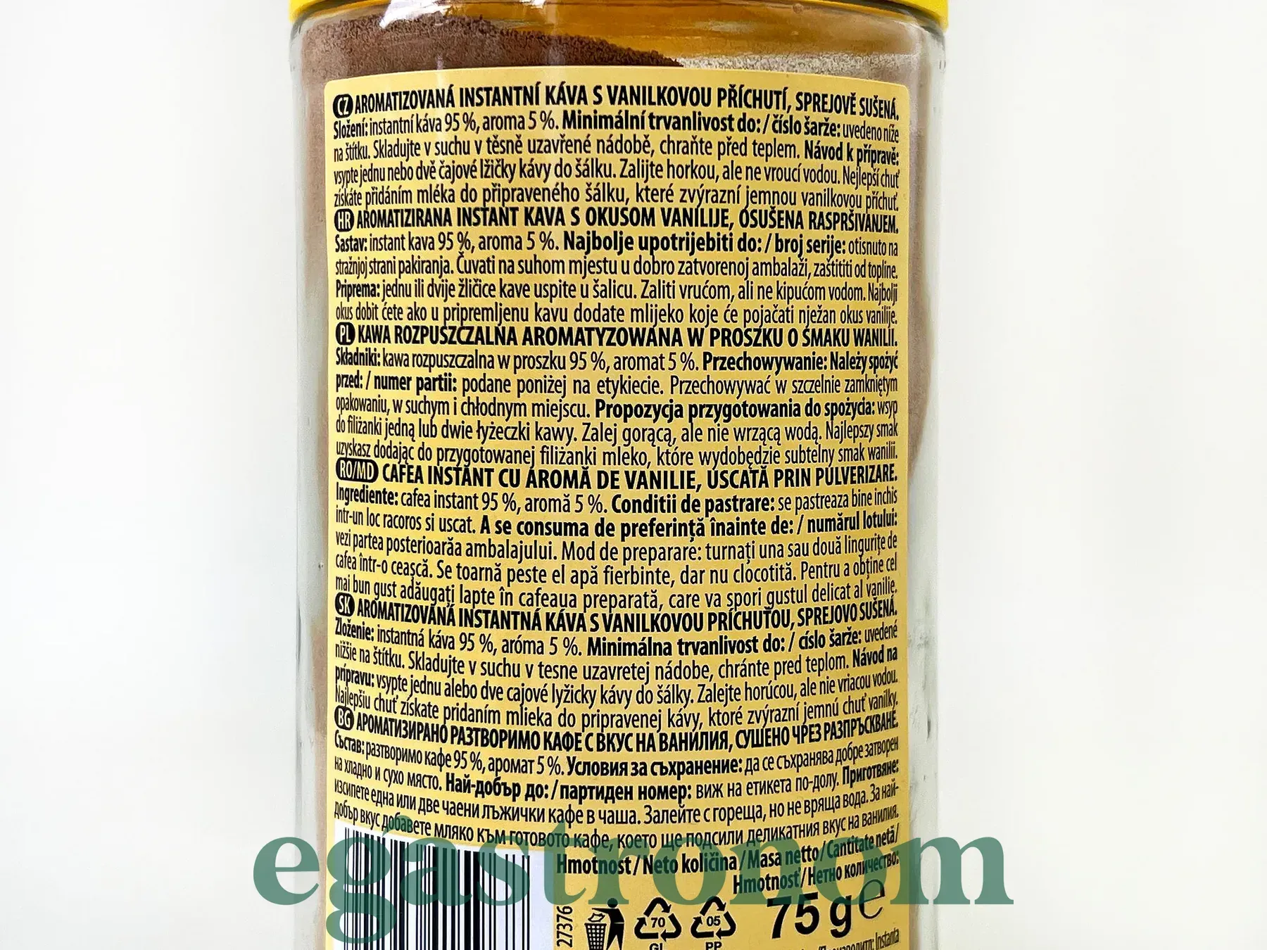 Вишукана розчинна кава з ніжним ванільним ароматом. Легка гірчинка кави поєднується з м’якою солодкістю ванілі, створюючи оксамитовий смак та теплий післясмак. Міцність середня (3/5). Ідеальна для кавових пауз протягом дня, особливо у поєднанні з десертами.
