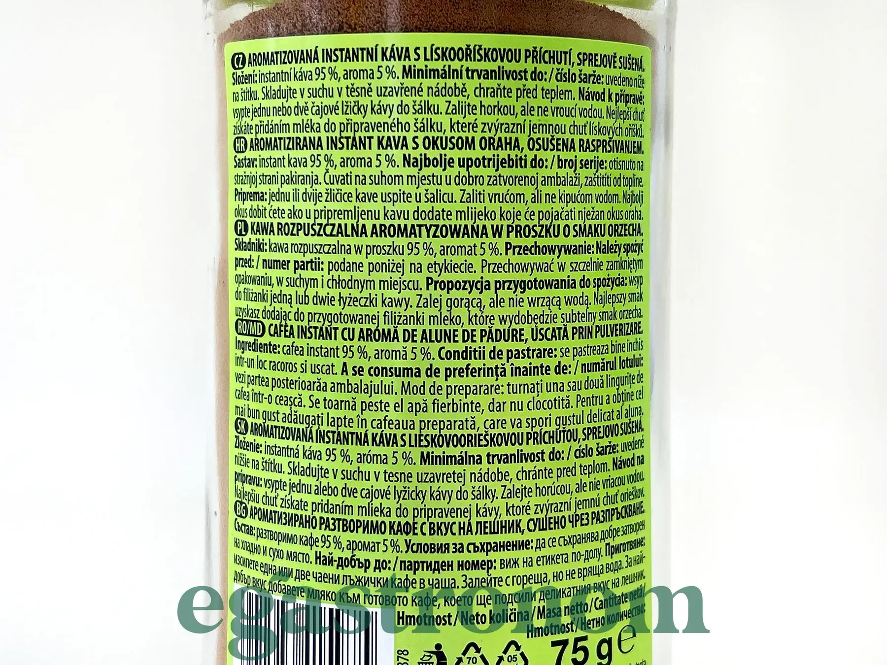 Ароматна розчинна кава з насиченим горіховим смаком. Поєднання класичної кавової гірчинки та м’яких відтінків лісового горіха створює гармонійний напій для справжньої насолоди. Міцність середня (3/5), післясмак ніжний і тривалий. Чудово смакує як без добавок, так і з молоком.