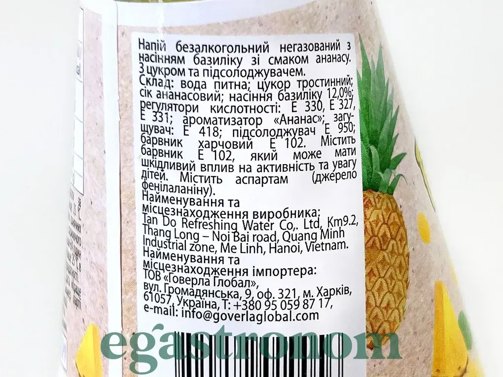 Екзотичний ананасовий напій з насінням базиліку — освіжаючий, трішки кислуватий і неймовірно ароматний. Завдяки натуральному соку ананаса та високому вмісту насіння, він не лише втамовує спрагу, а й додає енергії. Кількість на палеті: 2304шт.