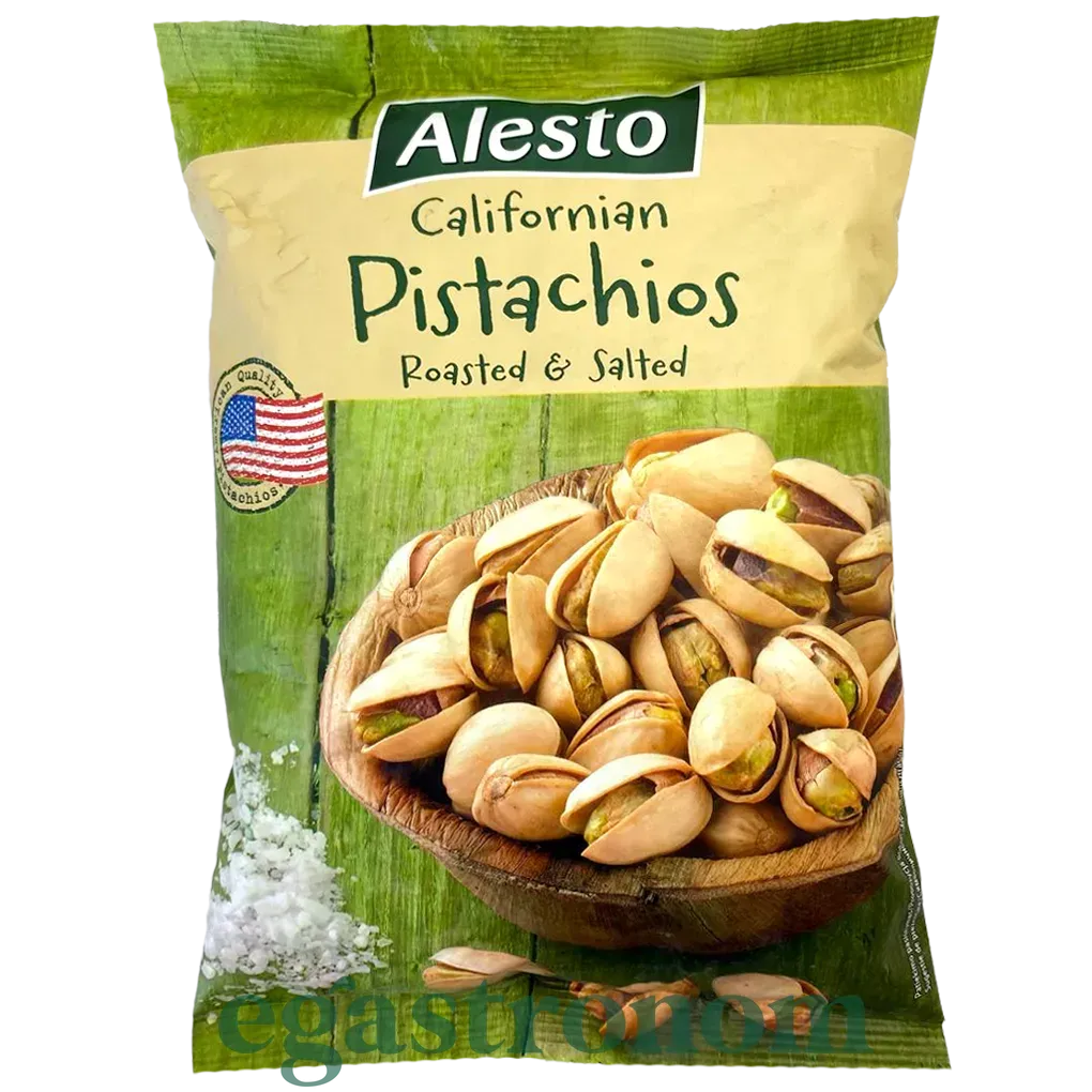 Фісташки Alesto - це якісний продукт, вироблений в Німеччині відповідно до європейських стандартів якості. Добірні каліфорнійські фісташки без зайвого сміття і шкарлупи. Каліфорнійскі фісташки відрізняються дуже великим розміром горіха, також при їх приготуванні використовується сухе обсмажування.